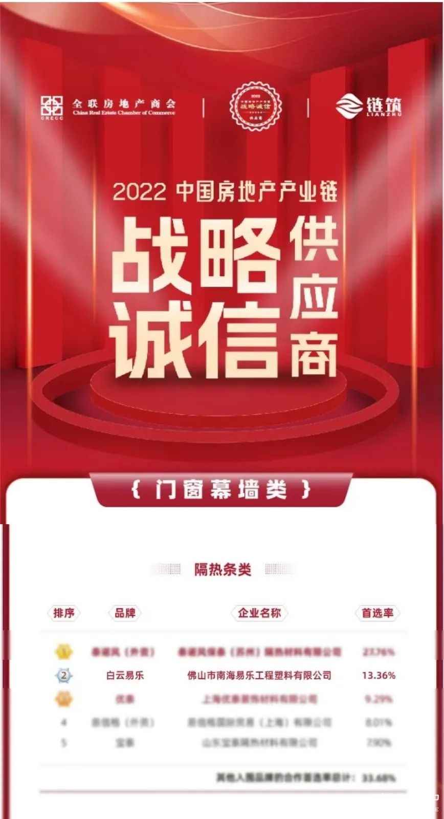 2023年2月25日,由全联房地产商会、链筑两会联合主办的“大变局与新未来”中国房地产产业链战略创新峰会暨2022年度盛典在北京隆重举办,会上发布了《2022中国房地产产业链战略诚信供应商研究报告》。报告显示,“白云易乐”以13.36%的首选率荣登“2022中国房地产产业链战略诚信供应商·门窗幕墙隔热条类品牌“榜单,并占据国内隔热条品牌第一,中国隔热条行业领导品牌,实至名归!