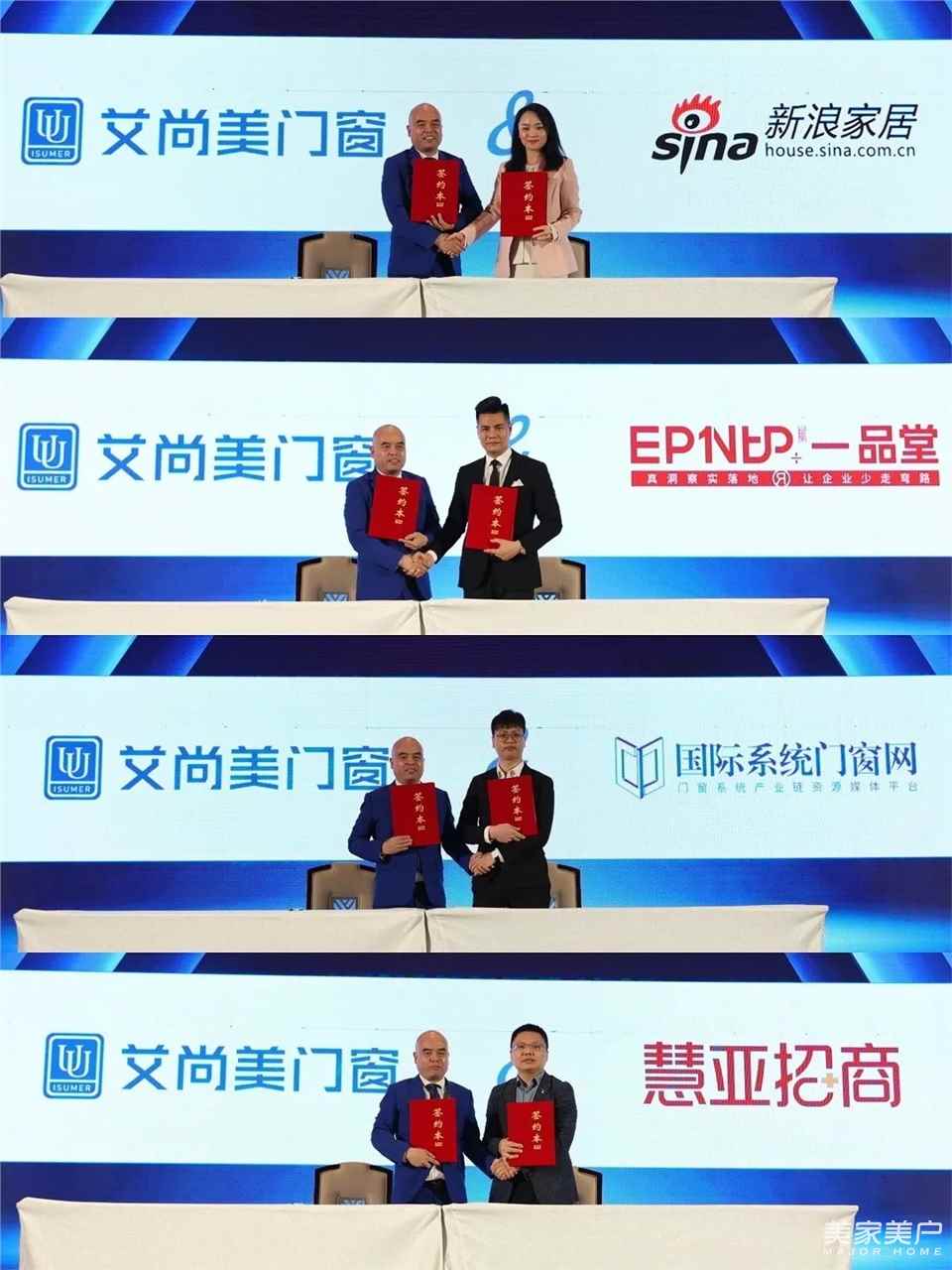 艾尚美门窗现场与慧亚、 新浪、 国际门窗网、一品堂合作单位举办隆重的战略合作签约协议。