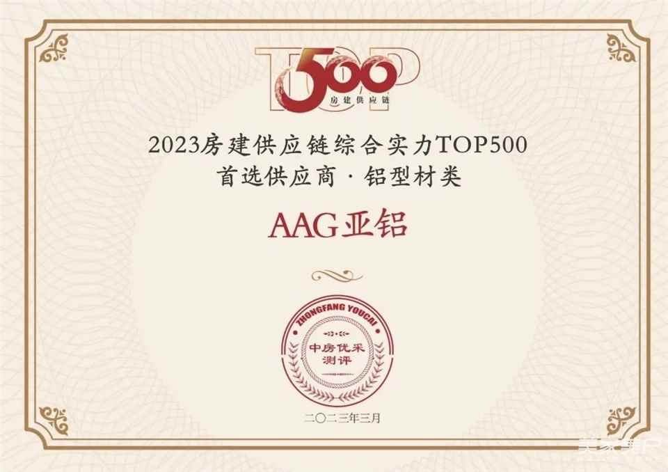 AAG亚铝荣膺“2023房建供应链企业综合实力TOP500首选供应商•铝型材类”10强