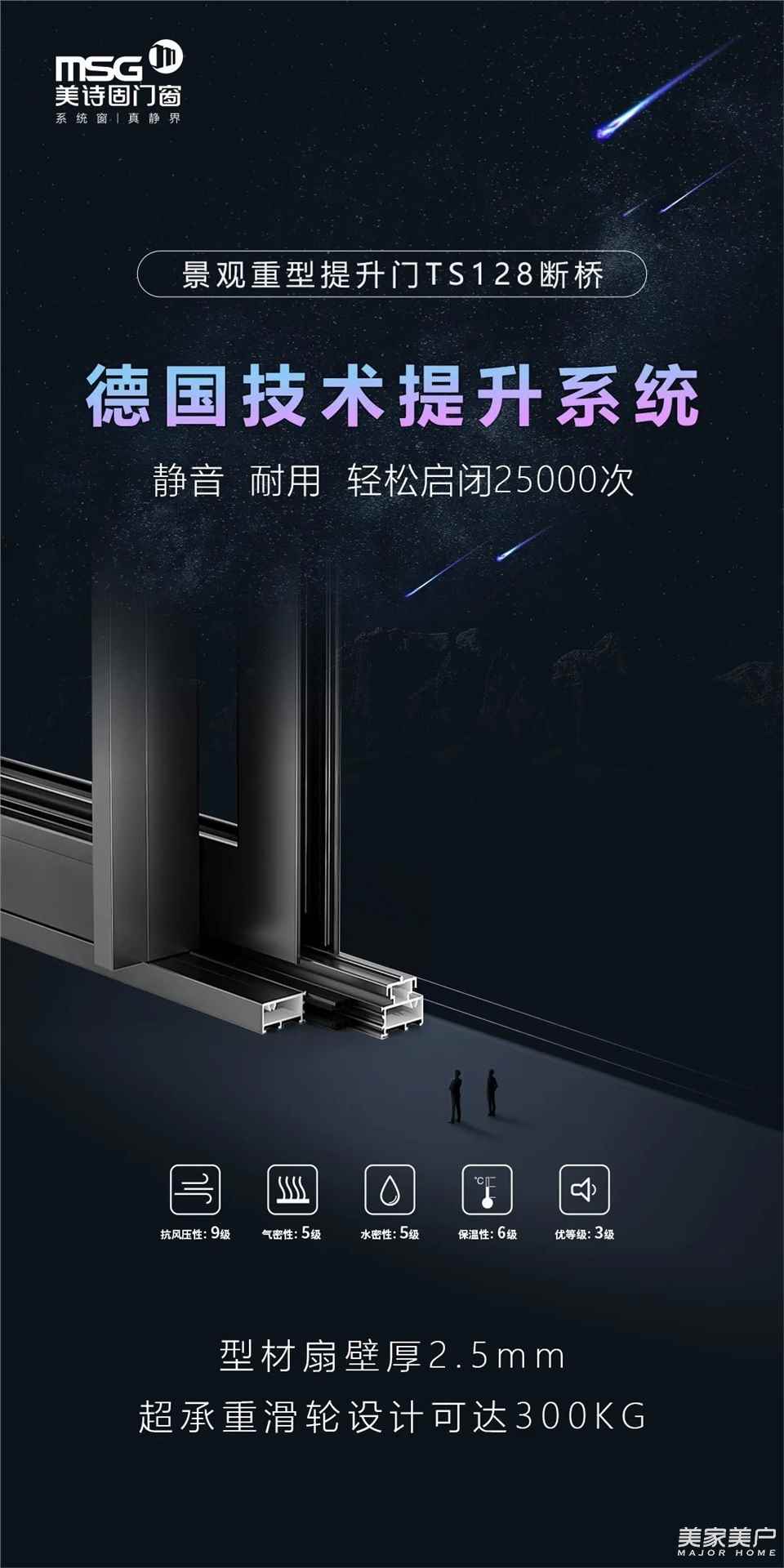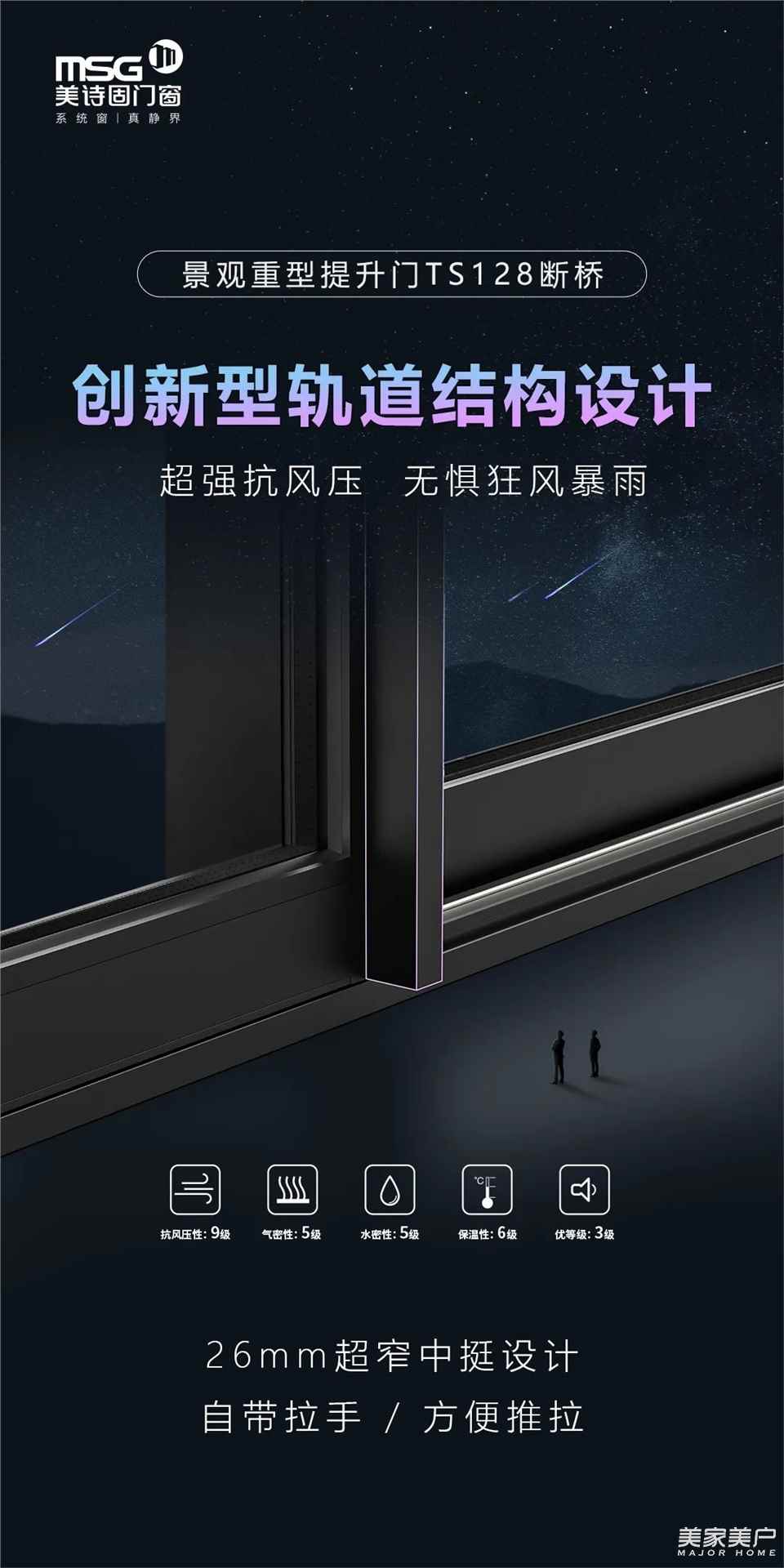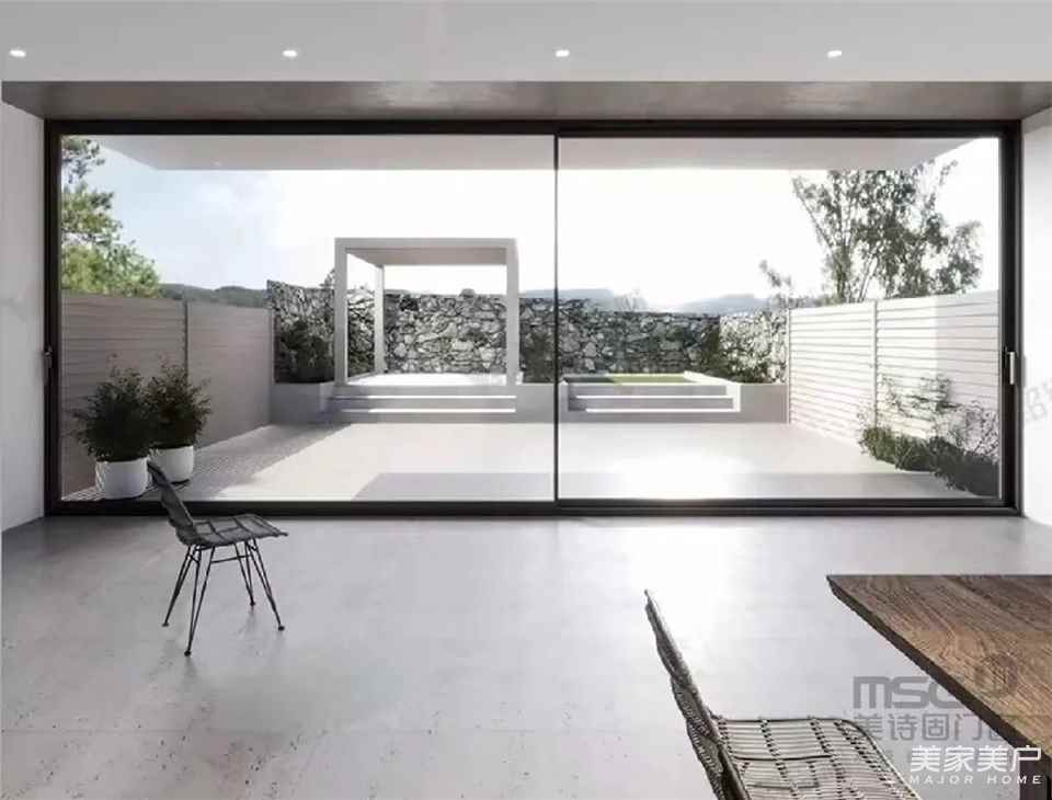美诗固『景观重型提升推拉门TS128』通过极简主义风格设计、实用功能与创新美学结合、非凡格调、百变搭配、风光无限,门里门外,自成一道风景线~现代建筑美学的精髓尽显无遗,悄无声息地从天地中攫取悦目的自然景观,捕捉光影之美,打造视觉新境,展现纯粹与宁静的生活。