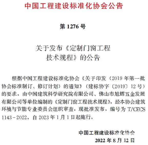 中国工程建设标准化协会标准T/CECS 1143-2022《定制门窗工程技术规程》已发布,自2023年1月1日起实施。该标准由中国建筑科学研究院建筑幕墙门窗研究中心主编。
