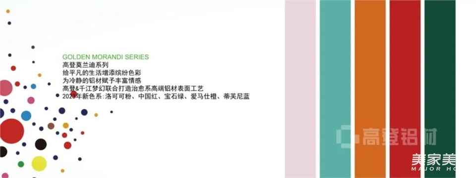 高登是最懂得“察言观色”的行业高端领军品牌,我们相信铝材高层次的功能是人个性气质的彰显和生活态度、生活方式的选择,表面处理也不应该再拘泥于传统标配的黑白灰,而是应该通过设计展示品牌独特的视角和敏锐的观察力,勇敢玩色,大胆创新,融汇今昔精华。「高登莫兰迪系列」,便是重新审视生活中的色彩与中国文化经典,持续性地进行时尚探索,不断带给消费者色彩选择的惊喜
