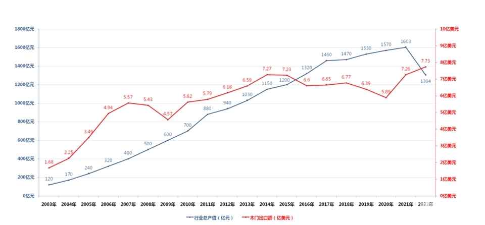 自2003年有数据统计以来,中国木门行业快速发展,行业产值连续18年呈现正增长。2022年,由于受到疫情防控、房地产下行、消费预期下降等多重因素影响,木门行业产值首次出现下滑。据不完全统计,中国木门行业规上企业2022年总产值为1304亿元,同比2021年下降18.65%。