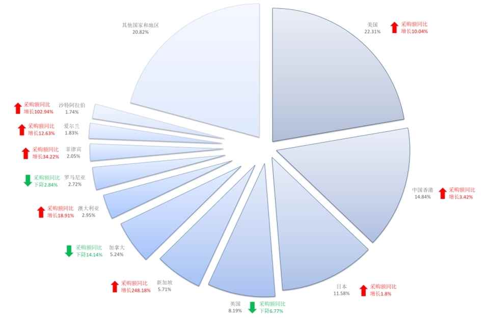 2022年木质门出口额为7.73亿美元,同比2021年增长6.47%。出口实现增长的原因来源于疫情期间全球贸易伙伴依然保持着一定的采购量,尤其是主要贸易伙伴。采购额排名前11位的国家(地区)中,有8个国家(地区)采购额同比2021年有所增长,新加坡增长248.18%,沙特阿拉伯增长102.94%,菲律宾增长34.22%,澳大利亚增长18.91%,爱尔兰增长12.63%,美国增长10.04%,中国香港增长3.42%,日本增长1.8%。加拿大采购额同比下降14.14%,英国采购额同比下降6.77%,罗马尼亚采购额同比下降2.84%。