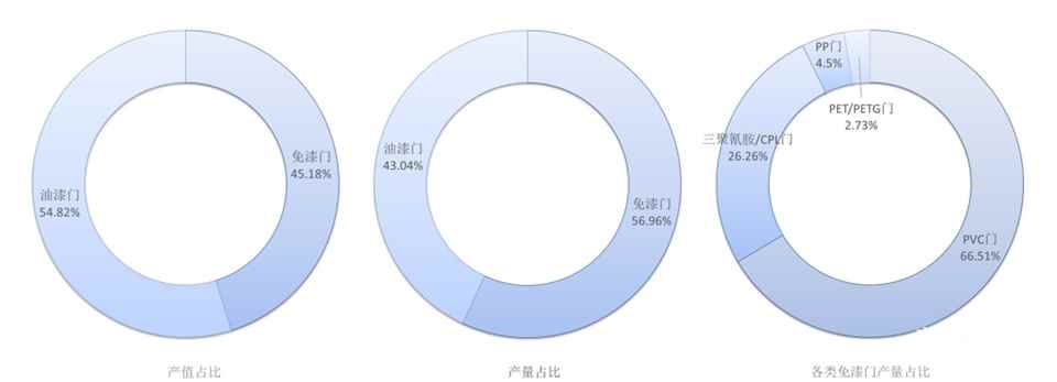 木门单品方面,油漆门、免漆门产值占比分别为54.82%和45.18%,产量占比分别为43.04%和56.96%。在免漆门细分品类中,PVC类产量占比最高,其次为三聚氰胺/CPL类,其他品类不足10%。