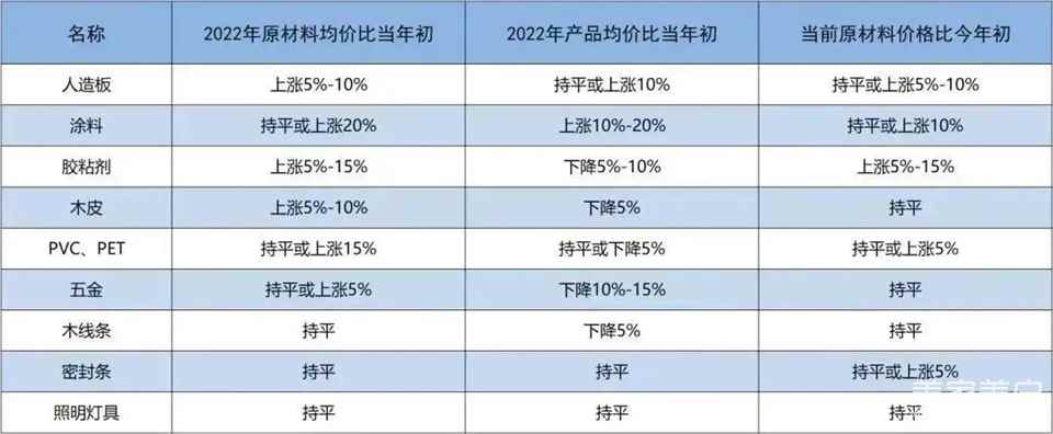 木门及定制家居行业的上游产业链产品多数与工业基础原材料有关。自2020年开始,国际大宗商品价格频繁波动上扬,化工原材料价格居高不下,造成木门及定制家居企业的材料成本在2022年持续高位震荡。据我会调研显示,截至2022年末,人造板、涂料、木皮、PVC/PET、五金等企业的原材料成本比当年初均有不同程度上涨,成品价格涨跌不一,且部分领域2023年1—2月原材料价格仍持续上行。由此判断,木门及定制家居企业的材料成本一段时期内或将持续高位运行。