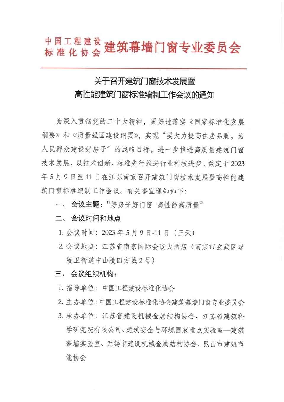 建筑门窗技术发展暨高性能建筑门窗标准编制工作会议将于5月9日至11日在南京召开