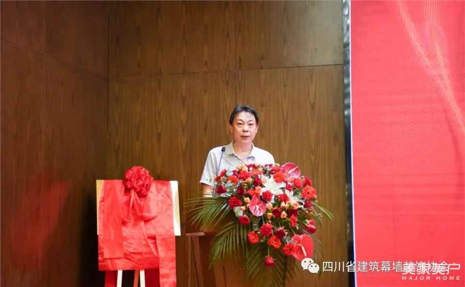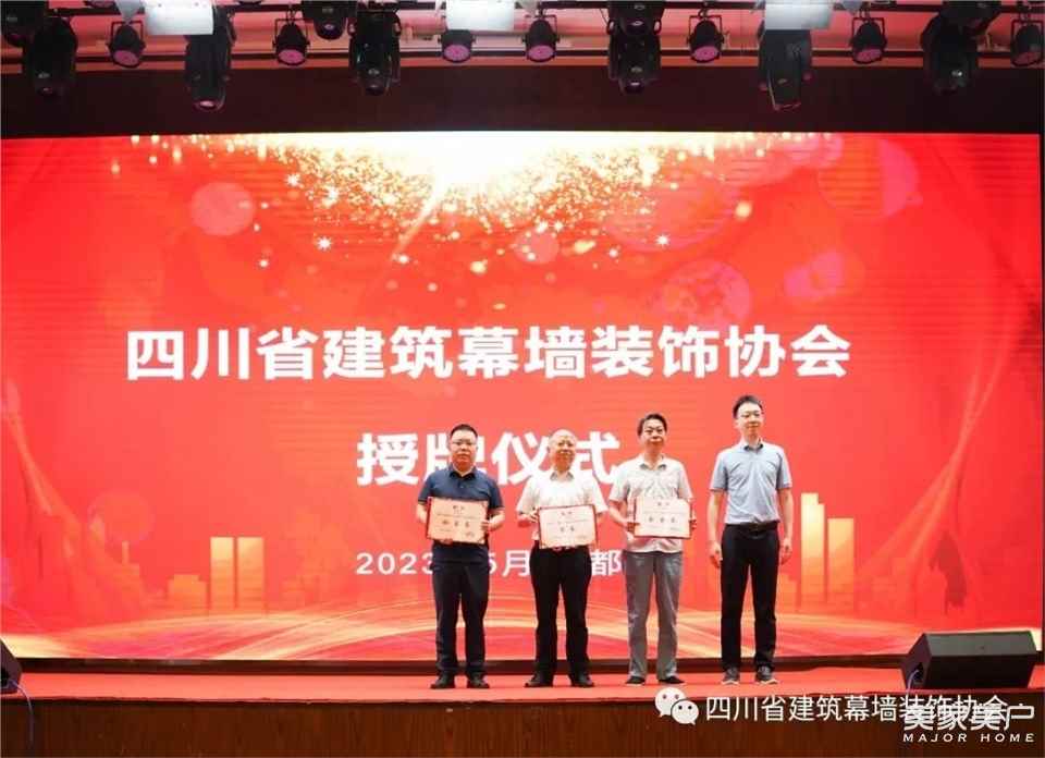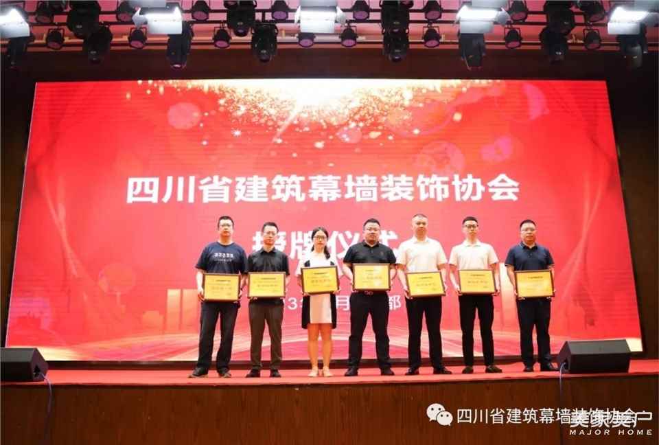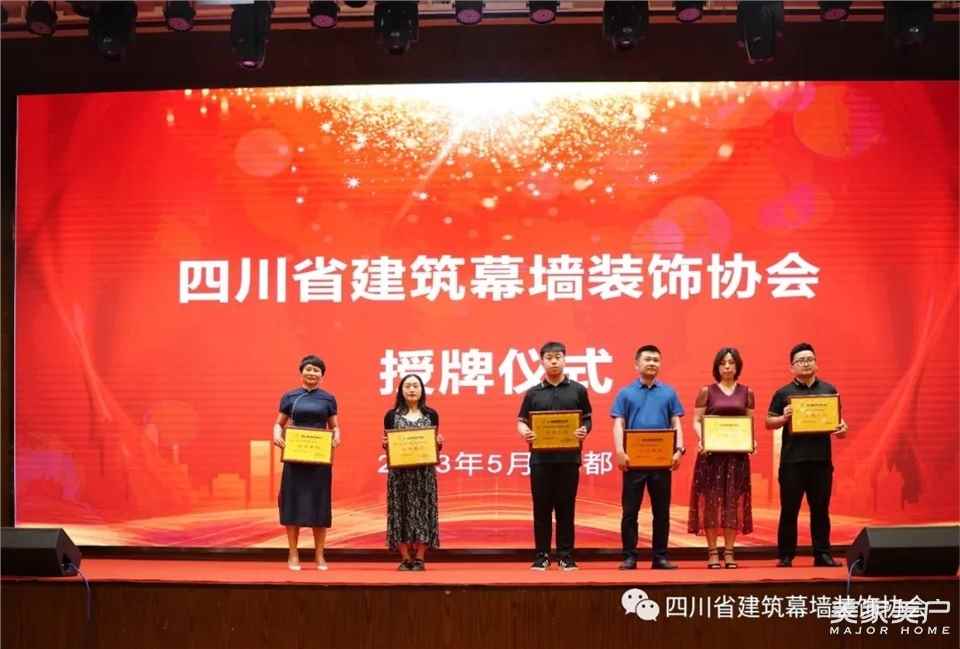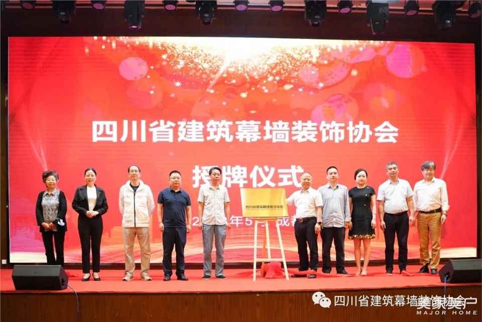 由会长王勤、副会长姚广顺、秘书长李曙鹏、副秘书长吴智勇、方丽,住建厅联合党委項玲珍、土木建筑学会蒋亚玲、房地产协会郑海涛、金属幕墙门窗分会牛晓、重庆耀皮玻璃蔡建忠共同为“四川省建筑幕墙装饰协会”揭牌。