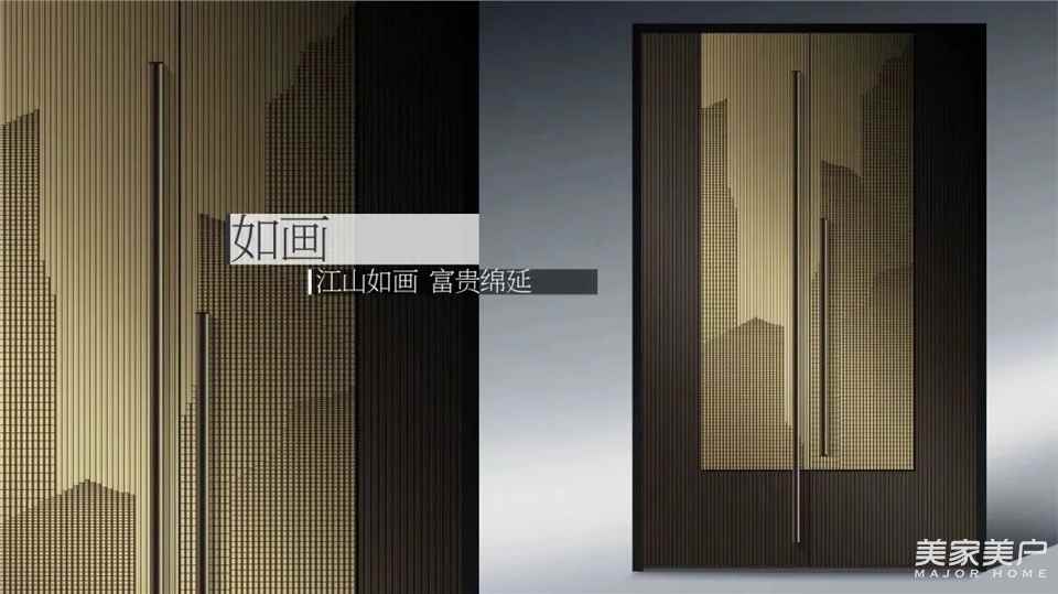 江山如画,心驰神往!取水墨山水为基底,以入户门展现东方国画韵味。铜色与褐色相拼散发高贵雅致东方气质,张弛有度、素雅相宜。