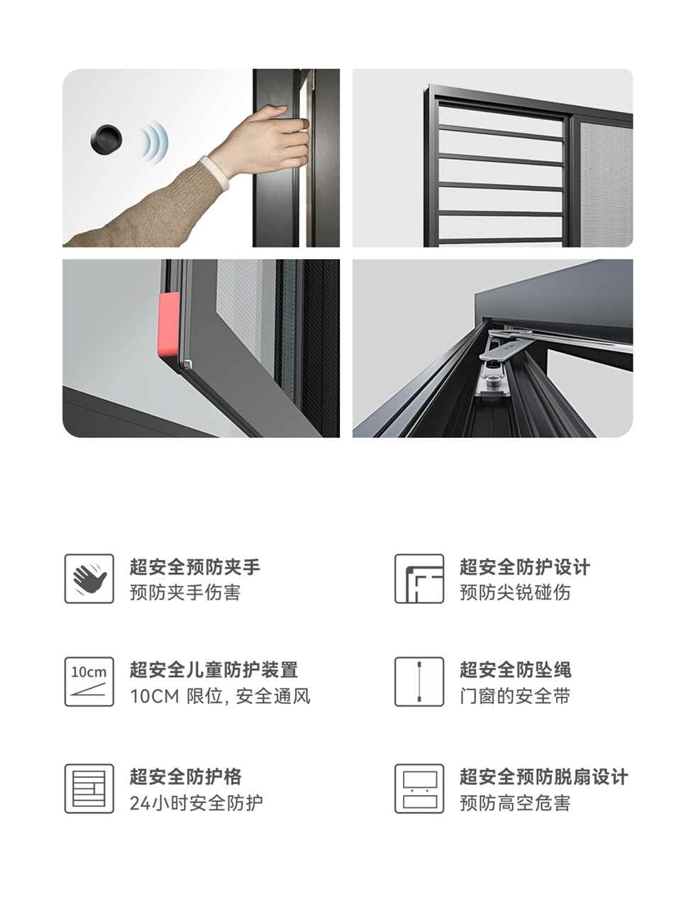 针对门窗居家生活使用中常见的“夹手、碰刮、坠落”三大安全问题,研发打造超安全三防系统门窗——“预防夹手、预防碰伤、预防坠落”,为关爱儿童居家安全,保驾护航。