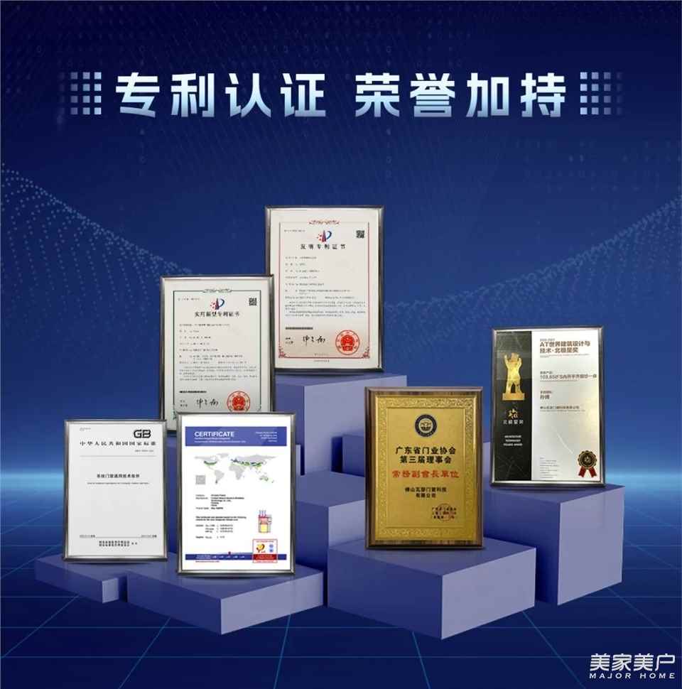 专利认证,荣誉加持,获得《系统门窗通用技术条件》参编单位、广东省门窗协会常务副会长单位、德国PHI认证、AT世界建筑设计与技术北极星奖等荣誉。