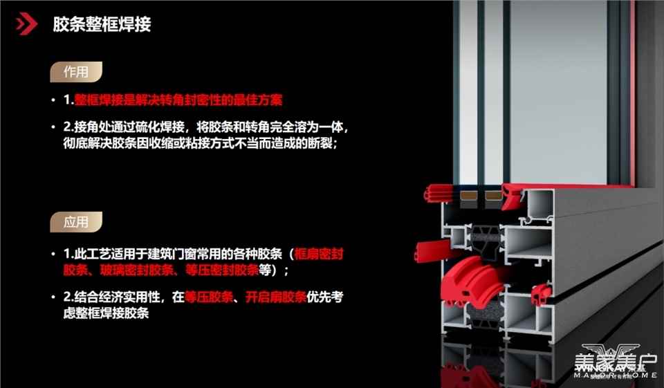 整框焊接能够彻底解决胶条因收缩或粘接方式不当而造成的断裂,并且焊接时间仅需3-4分钟,成品率达99%,美观度极高,可实现批量化生产,在提高生产效率的同时,大大降低了生产成本,有效解决密封胶条转角的封密性和美观度问题,为门窗产品的品质和颜值升级,提供了更优的解决方案。