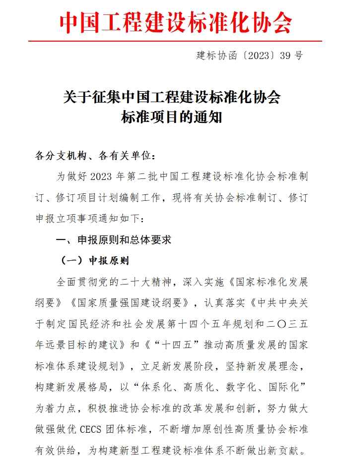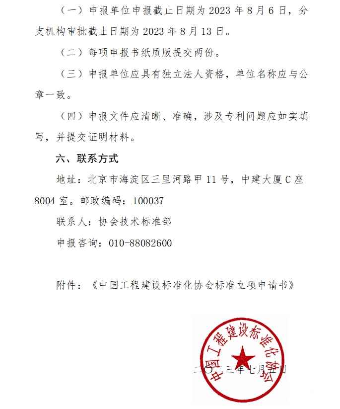 2023年第二批中国工程建设标准化协会标准制订、修订项目申报工作已于开始,欢迎各单位积极申报。申报请注意以下几点:1、申报单位在中国工程建设标准化协会网站(www.cecs.org.cn)标准管理平台进行注册,平台选择报送分支机构“建筑幕墙门窗专委会”。2、申报单位填写《中国工程建设标准化协会标准立项申请书》,申报书word版发送至建筑幕墙门窗专委会秘书处邮箱(cecs@cabr-bctc.com)。3、秘书处对申报文件审核后,通知申报单位修改完善,申报单位提交申报书至协会平台,并将盖章版纸质申报书(一式两份)快递至秘书处。4、专委会申报截止日期为2023年7月31日。 秘书处联系电话:010-88361153