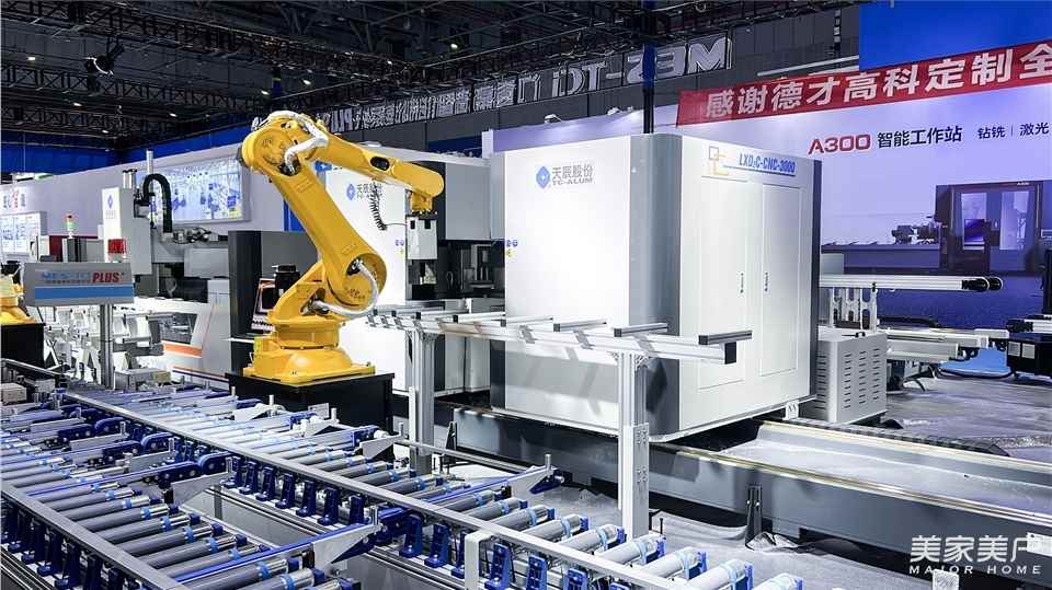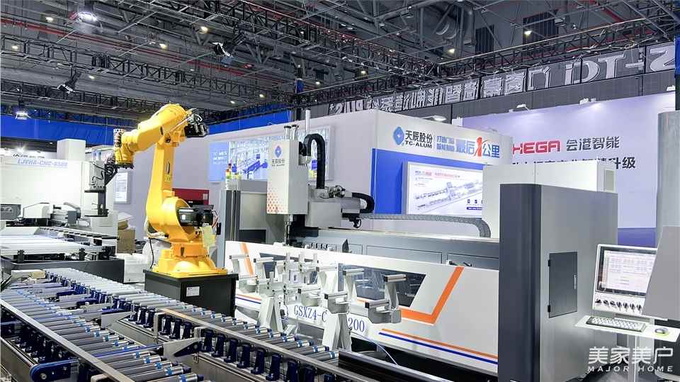 在本次展会上,天辰股份带来了全新的铝门窗智能化生产线。该生产线由全自动的数控锯铣中心(配置激光切割头+钻铣动力头+任意角度锯切单元),以及数控钻铣中心和数控双头端面铣组成。由于展位长度的限制,在展会现场,该生产线仅展示了一台锯铣中心配置一台钻铣中心和一台数控双头端面铣。但在实际配置中,可以采用多台钻铣中心和多台数控双头端铣相互配合的模式,并可以配置智能齐套塔库及智能凝胶缓存库等,以满足客户不同产能及整厂智能化的需求。