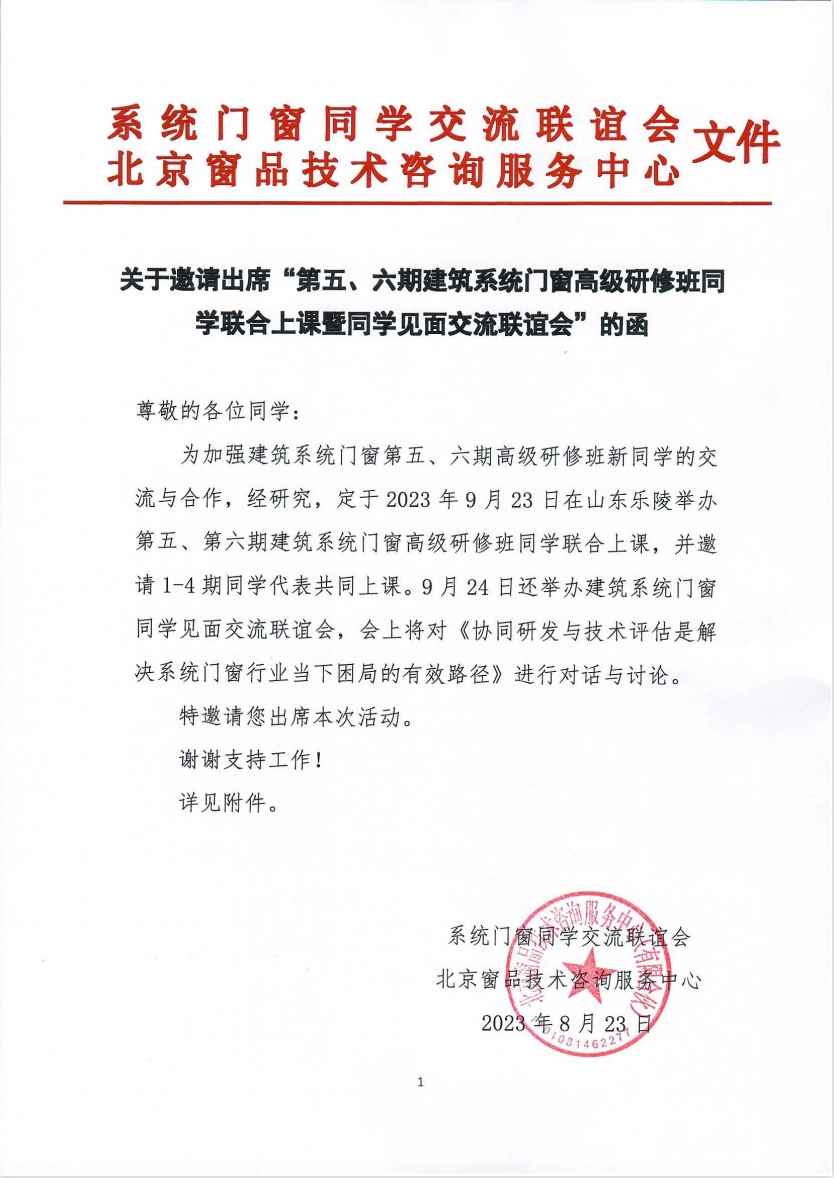 关于邀请出席“第五、六期建筑系统门窗高级研修班同学联合上课暨同学见面交流联谊会”的函