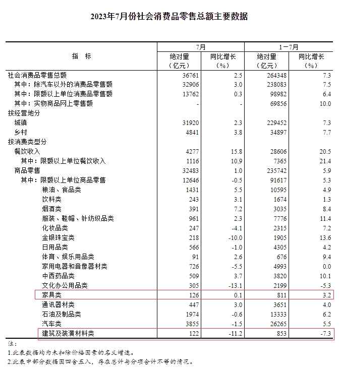 8月15日,国家统计局发布2023年7月社会消费品零售总额。数据显示,7月家具类零售总额为126亿元,同比增长0.1%,环比下降13.1%;1-7月零售总额为811亿元,同比增长3.2%。