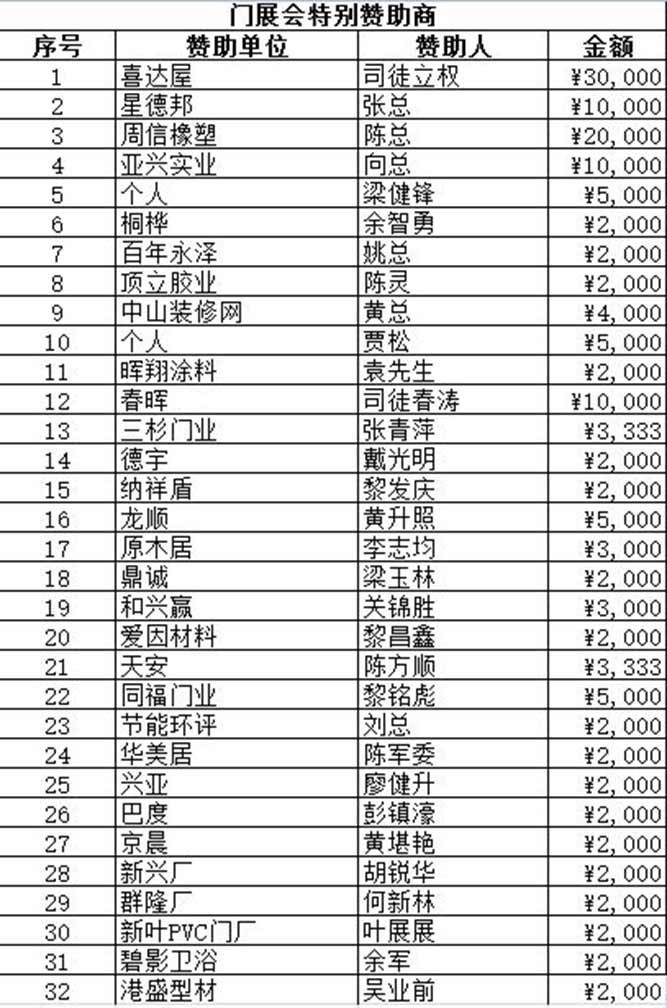 特许赞助商:周信橡塑、星德邦木器漆、亚兴实业。