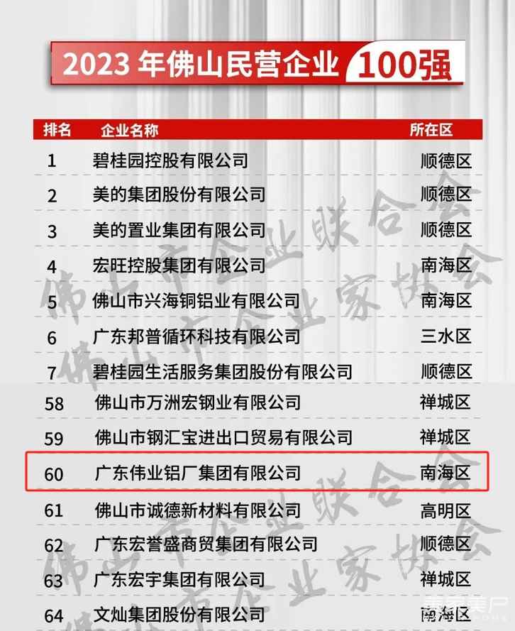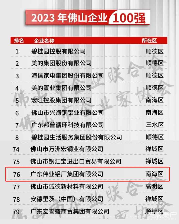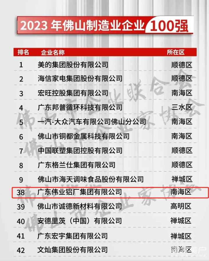 9月27日,由佛山市总商会、佛山市企业联合会主办的“2023年佛山企业100强、制造业100强、民营企业100强”榜单重磅发布。广东伟业铝厂集团有限公司荣登“2023年佛山市企业100强”第76名、“2023年佛山市民营企业100强”第60名、“2023年佛山市制造业企业100强”第38名。