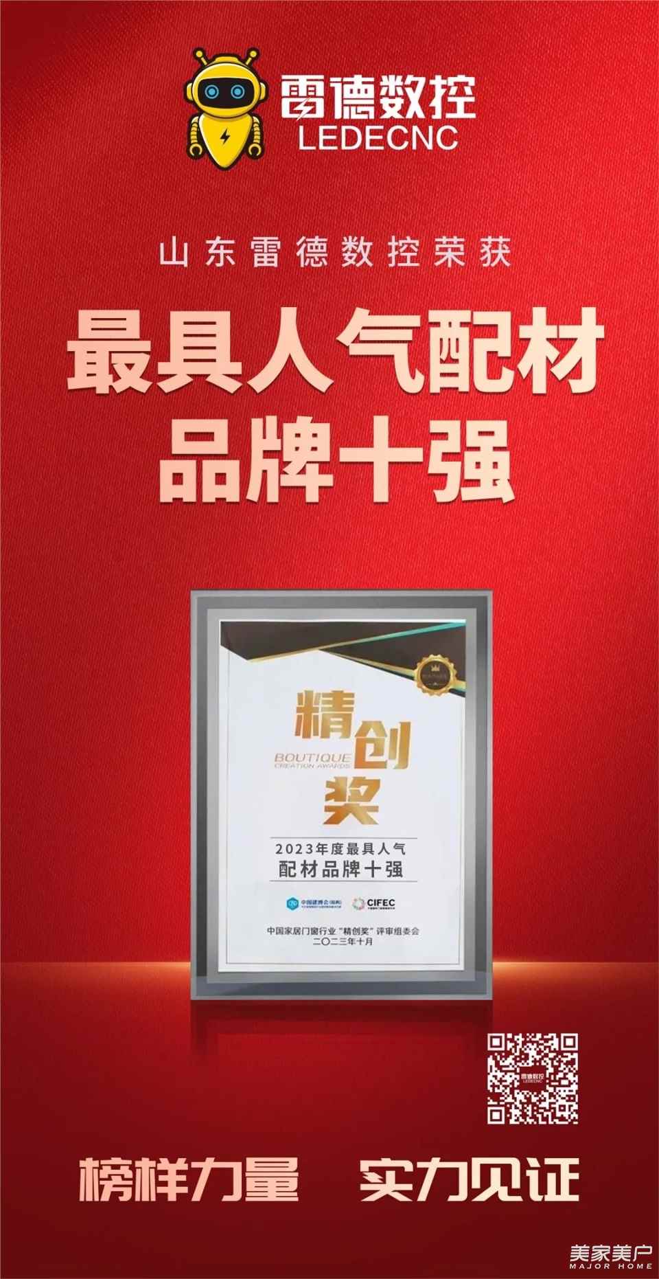 10月11日晚,第五届中国家居门窗行业“精创奖”颁奖典礼在山东临朐揽翠湖大酒店博雅厅隆重举行。雷德数控凭借卓越的市场表现及行业影响力,荣获“最具人气配材品牌十强”奖项、雷德数控董事长张爱民荣膺“2023年度门窗行业影响力人物”称号。