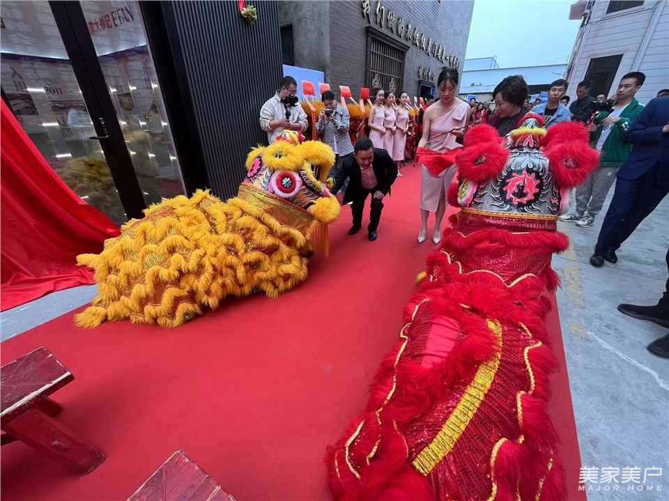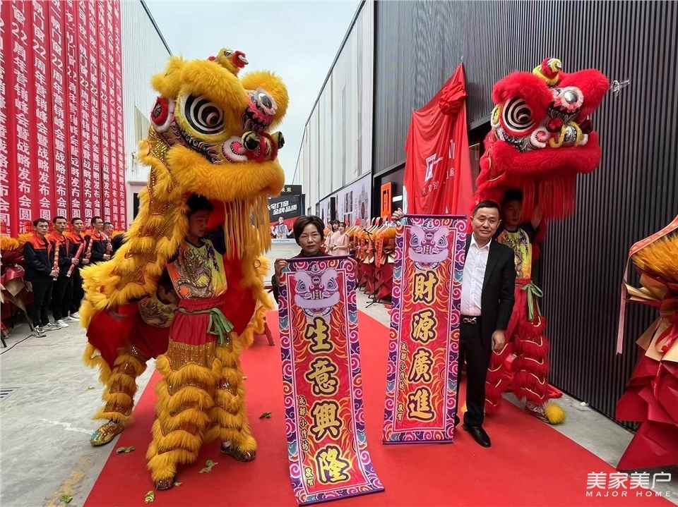 典礼上,一帆门窗董事长王勇、总经理杨申蓉共同为代表吉祥的雄狮点睛,寓意公司红红火火,财源广进。随后,一帆门窗董事长王勇、总经理杨申蓉接过了“生意兴隆”、“财源广进”的对联,标志着新展厅正式落成。