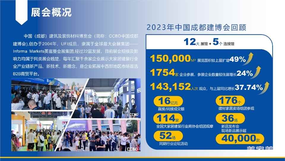 中国(成都)建筑及装饰材料博览会(简称:CCBD中国成都建博会)创办于2004年,是全球展览业协会(UFI)认证展会,展会规模已跃居全国同类展会前列。CCBD中国成都建博会一直致力于为全国建材家居厂家、经销代理商、房地产开发商、建设/装饰单位提供专业的商贸合作渠道,打造大家居建装行业以“经销代理”和“公装集采”为核心的优选平台。在深度把握成渝地区双城经济圈建设战略机遇,依托成渝地区的产业集群优势,2023年开始在重庆地区打造CCBD中国重庆建博会,逐步形成“成渝双展”4月成都10月重庆双城发展的新格局。