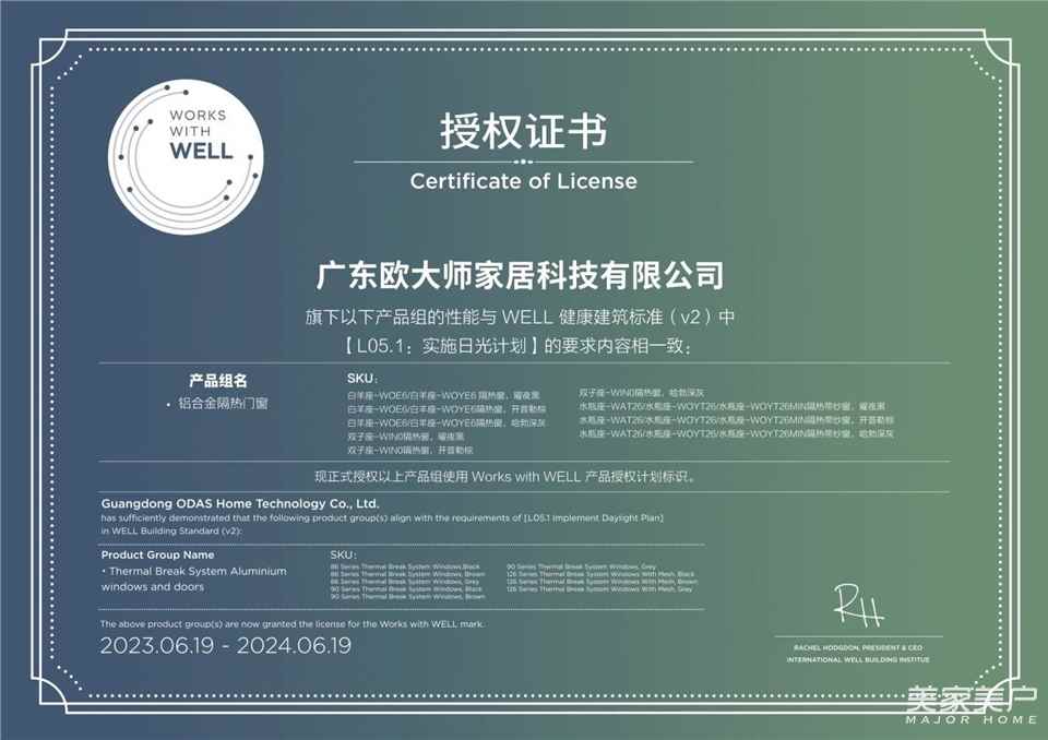 此次欧大师隔热门窗顺利通过 Works with WELL 的审核并获得授权,标志着欧大师隔热门窗在健康建筑领域取得了国际性的认可,与WELL健康建筑标准中的要求完美契合。这是门窗行业里一个具备重要意义的里程碑,标志着欧大师隔热门窗产品达到了全球最高健康标准的门槛,进一步印证了欧大师隔热门窗在低碳健康方面的领先地位,也预示着将为大众带来更为卓越的产品和服务!