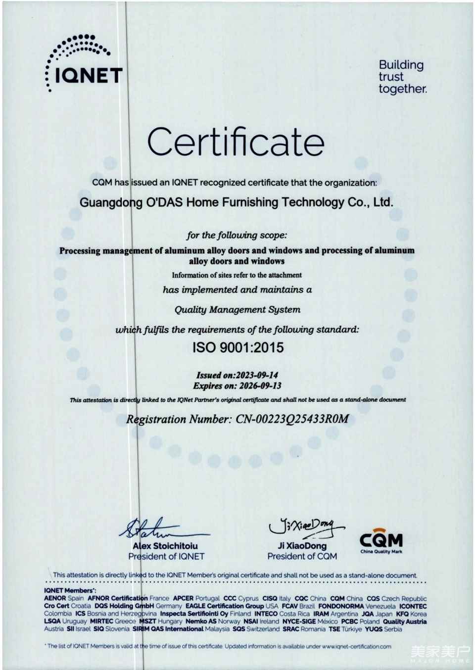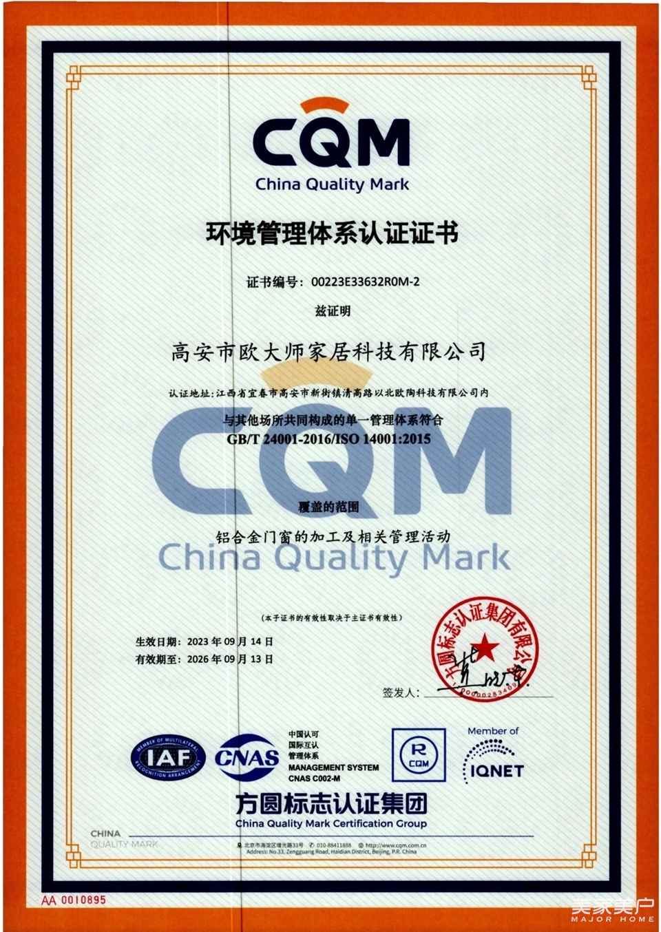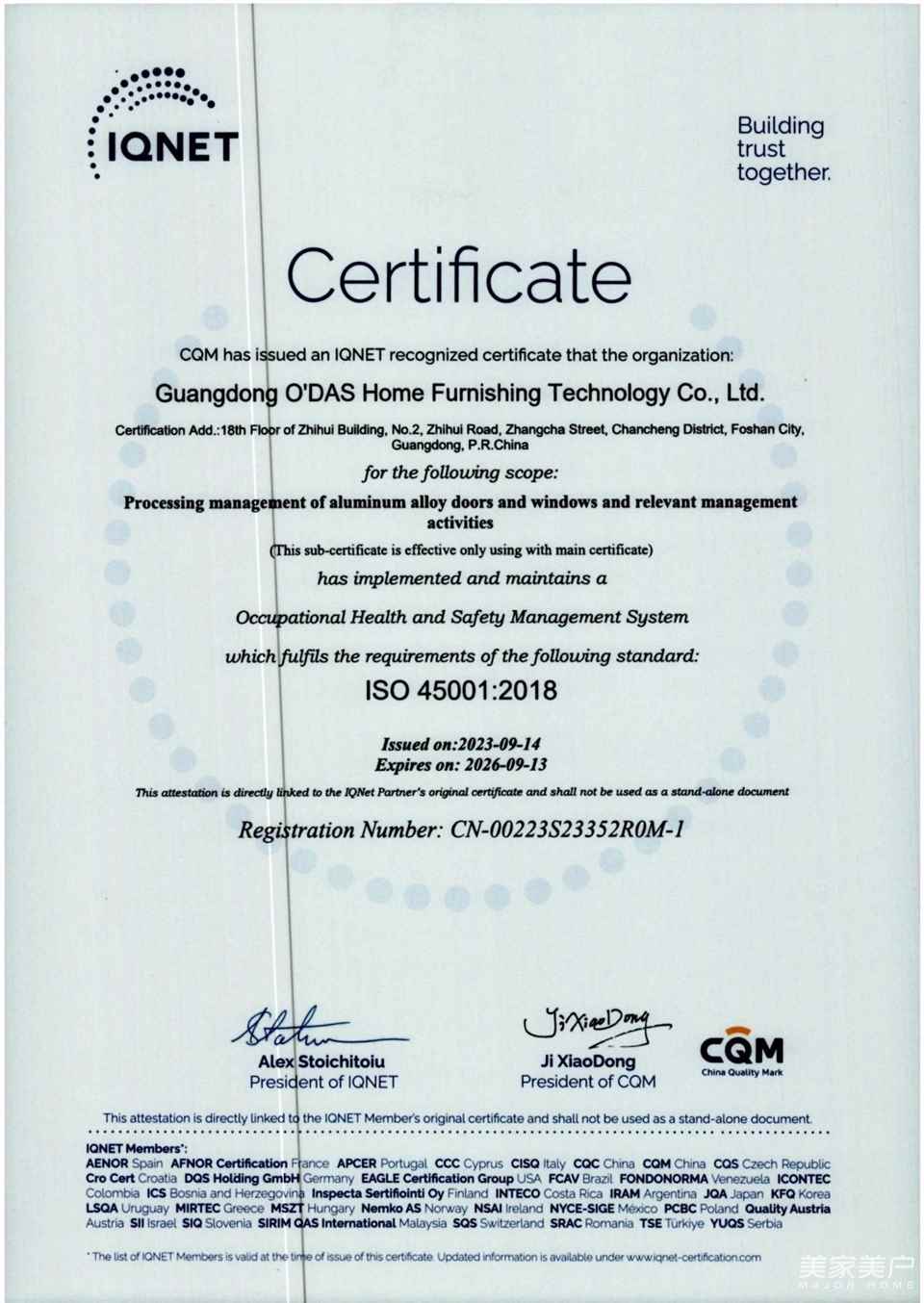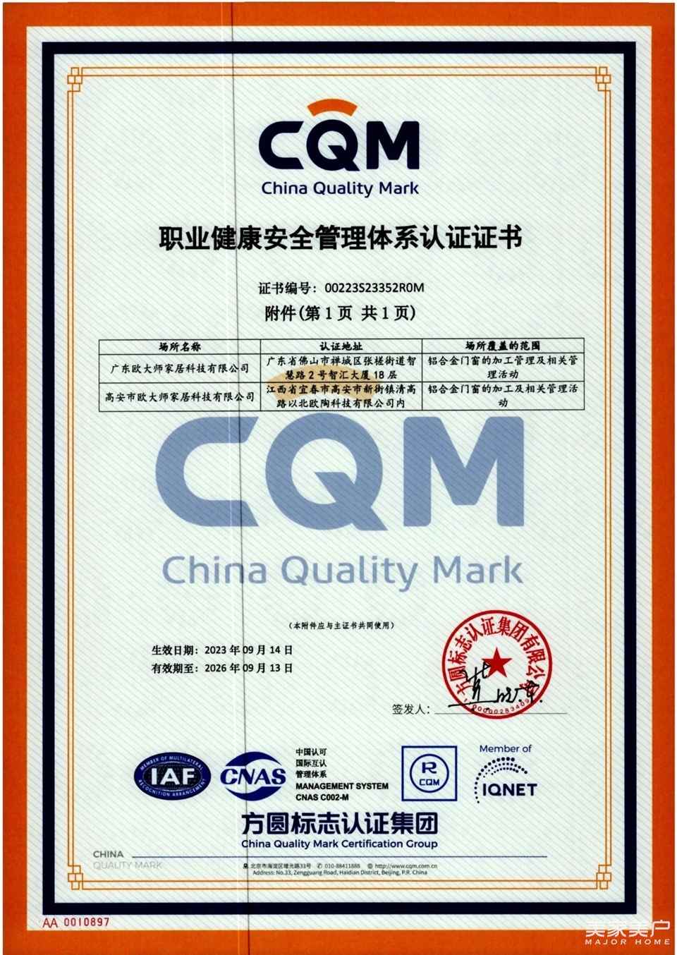 喜讯不断、捷报频传。经国家权威机构的认证与审核,近日欧大师隔热门窗顺利通过ISO9001质量管理体系、ISO14001环境管理体系、ISO45001职业健康安全管理体系三大认证,取得《质量管理体系认证证书》《环境管理体系认证证书》《职业健康安全管理体系认证证书》;