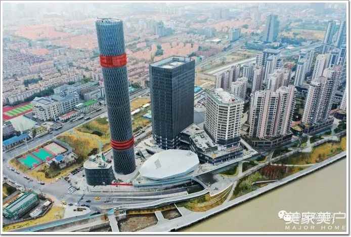 项目亮点:圆柱造型、塔身修长、线条简洁,外立面采用通透的玻璃幕墙,配上不锈钢的搪瓷百叶板……两端“金箍”造型和180米的高度,外形如同一根“定海神针”,耸立在黄浦江与长江交汇口。因其结构上采用与“上海中心大厦”外幕墙相同的体系(大跨度悬挑单层幕墙钢网壳),因此又被称为“小上海中心”。