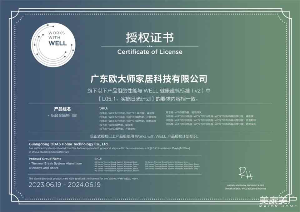欧大师隔热门窗自2023年成为WELL研发及管理单位IWBI的基石会员,充分展示了对于人类健康和低碳生活的高度重视。作为目前国内门窗行业里首家成为IWBI会员并获得 Works with WELL 授权的企业,正是标志我们的产品达到了全球最高健康标准的门槛,印证了在低碳健康方面的领先地位。