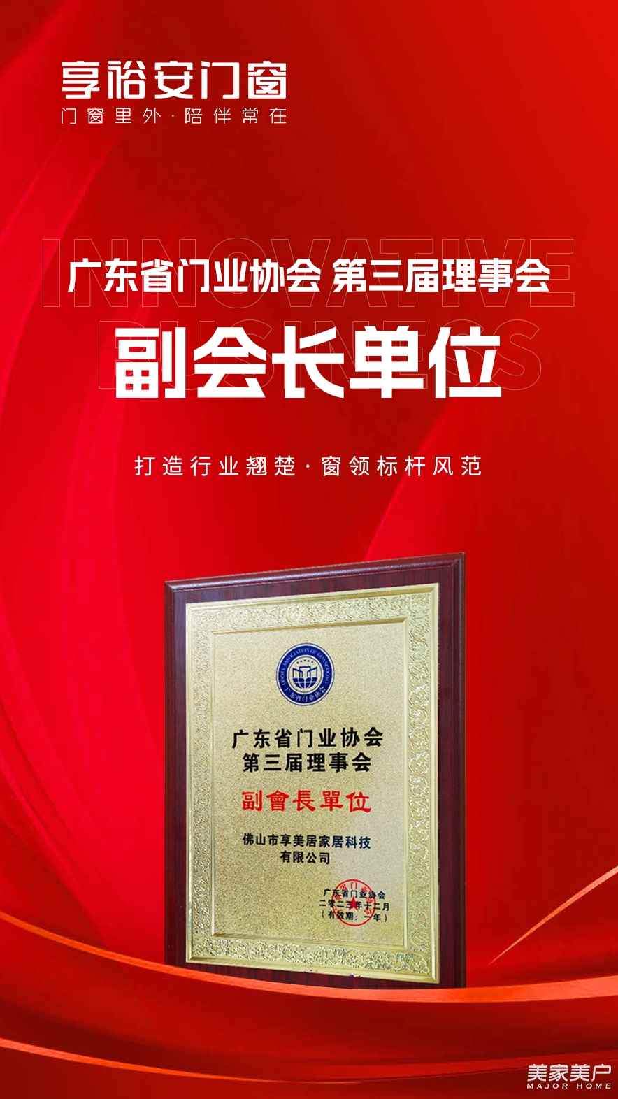本次大会上,享裕安门窗凭借强大的企业实力和品牌影响力,荣获广东省门业协会,“第三届理事会 副会长单位”荣誉称号。