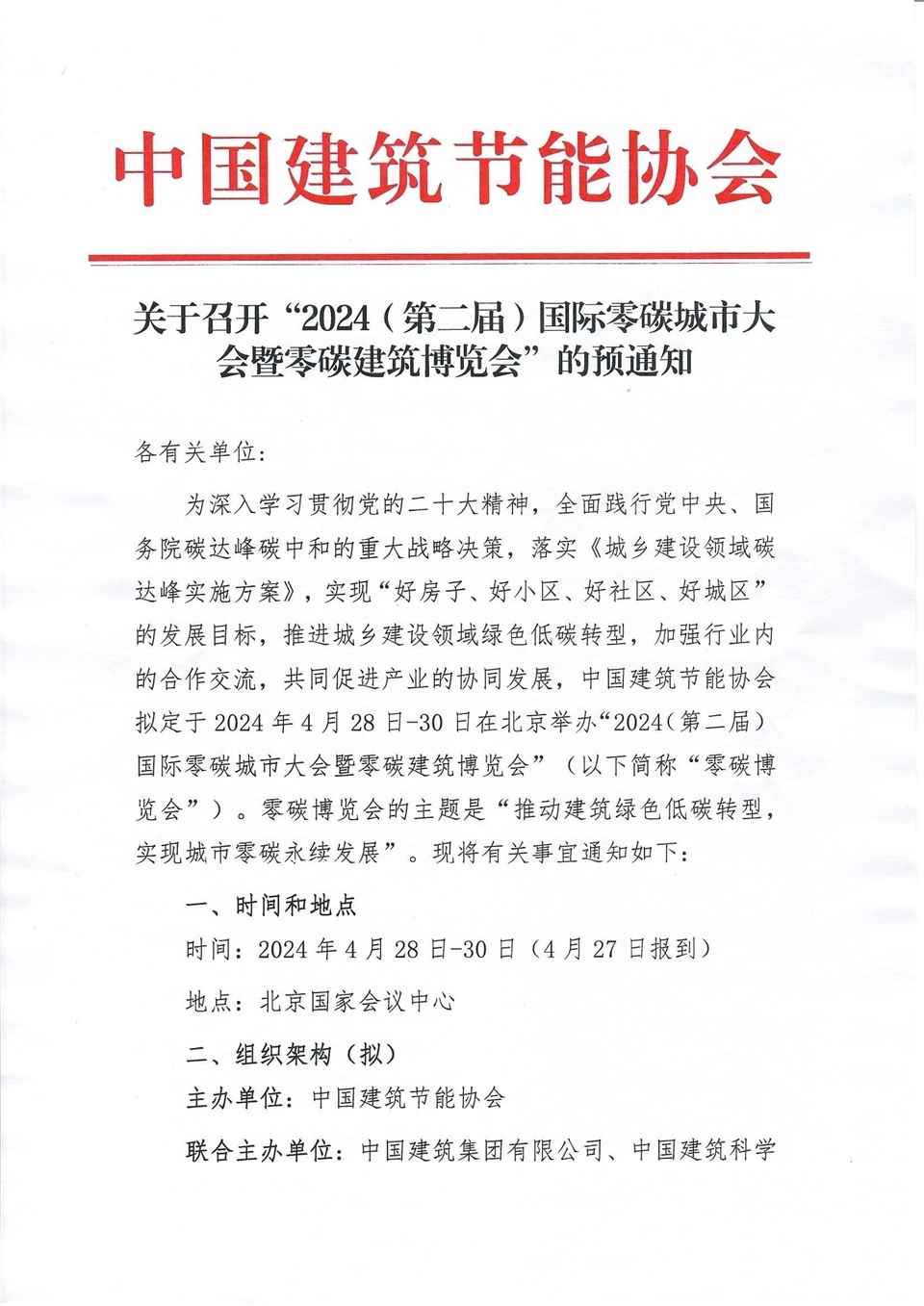 关于召开“2024(第二届)国际零碳城市大会暨零碳建筑博览会”的预通知