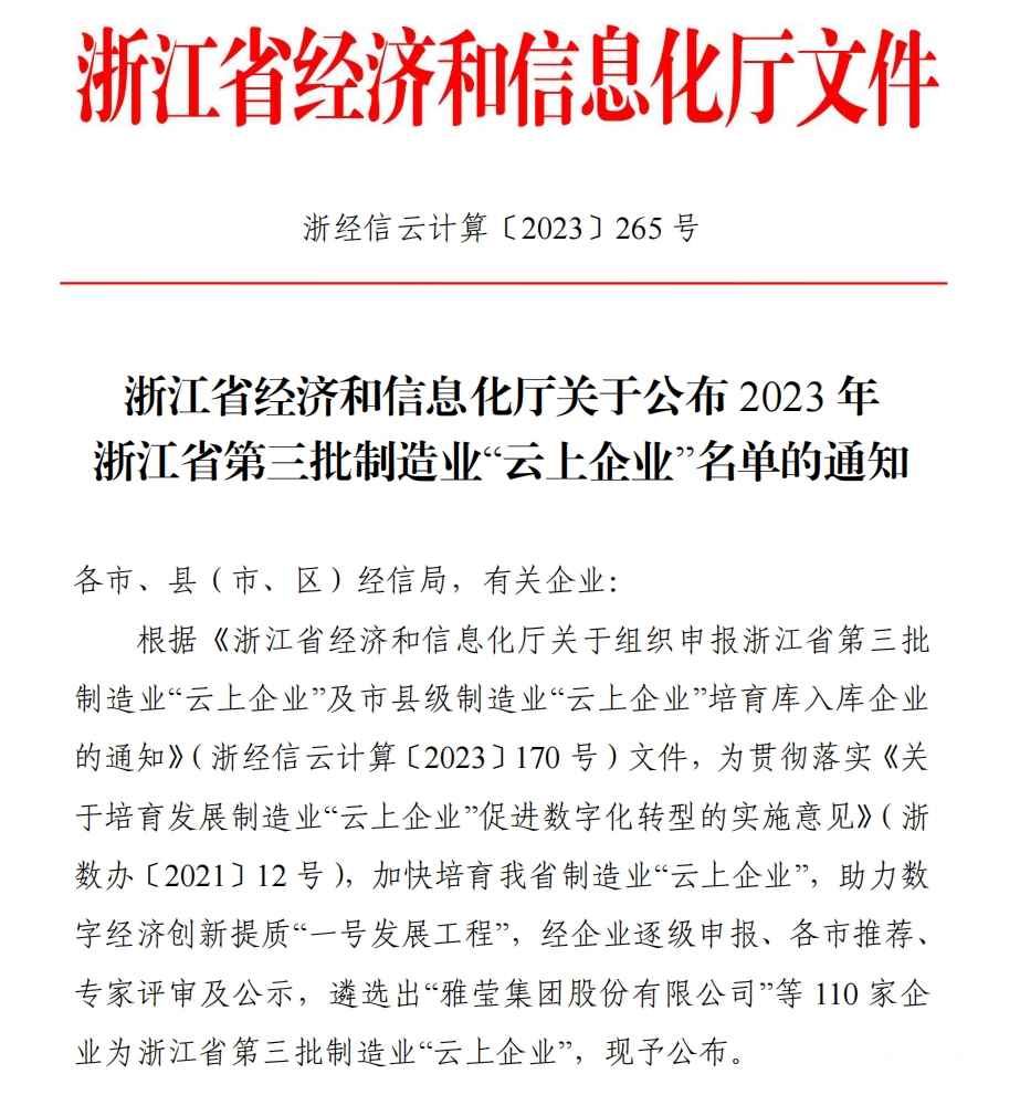 近日,浙江省经济和信息化厅公布了2023年浙江省第三批制造业“云上企业”名单,兴三星云科技股份有限公司凭借高效的信息化水平和完善的信息系统建设获评浙江省制造业“云上企业”。