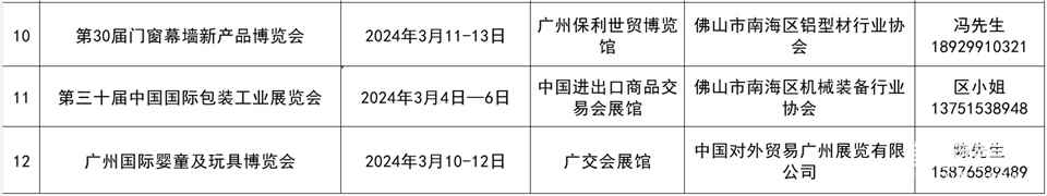 为贯彻落实“粤贸全国”的工作部署,支持佛山企业积极拓展国内市场,宣传佛山城市、产业和品牌形象,经对外征集、组织评审,现确定《佛山市商务局2024年上半年重点组织的国内展会项目》。参加列入2024年上半年重点组织的国内展会项目且符合相关申报条件的企业,可申报相关专项资金。请各区、各有关行业协会积极组织发动企业参展,不断加大对重点市场的开拓力度。有意参展的企业请自行向相关组展机构报名。