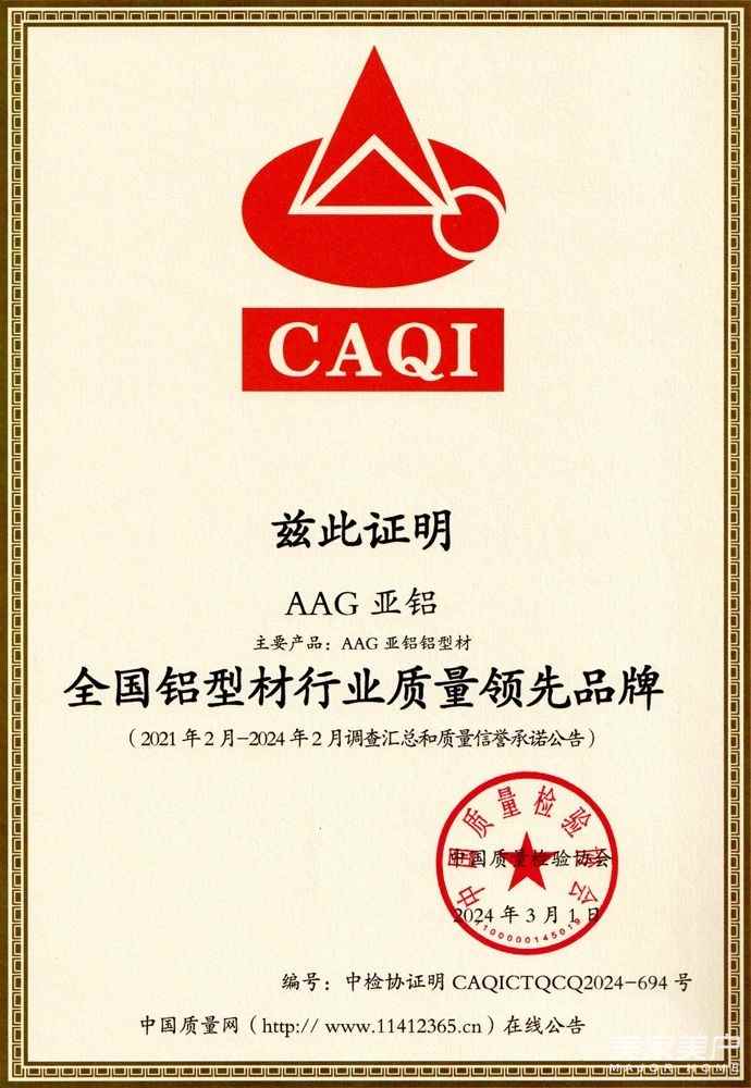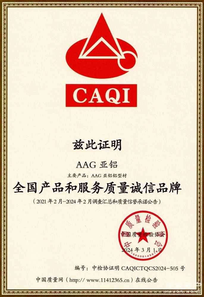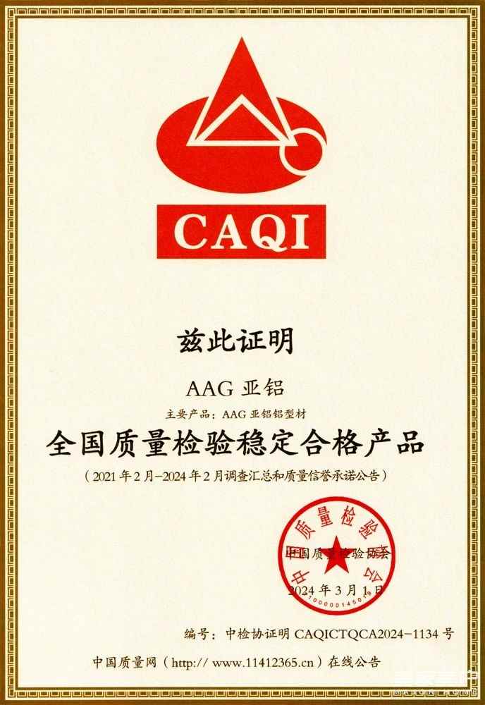 AAG亚铝此次获得来自中国质量检验协会的权威认可,这是对AAG亚铝在行业内所起到的大厂标杆作用的肯定,更是对AAG亚铝在产品质量和业务诚信方面一贯坚持做到最好的认可。