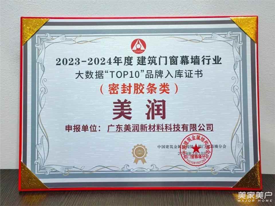 在本次全国铝门窗幕墙行业年会上,由中国建筑金属结构协会主办的“门窗幕墙行业数据申报及统计工作”,基于“公平、公正、透明、科学”的原则。经过分会严谨评审,美润新材凭借其产品在密封胶条领域的卓越表现,脱颖而出,颁发“2023-2024年度建筑门窗幕墙行业大数据‘TOP10’品牌入库证书”(密封胶条类),并被授予“密封胶条类 十大首选品牌”的荣誉称号,得到行业专家、客商、广大用户的高度认可和一致好评,彰显了美润新材在密封胶条领域的领先地位和品牌影响力。