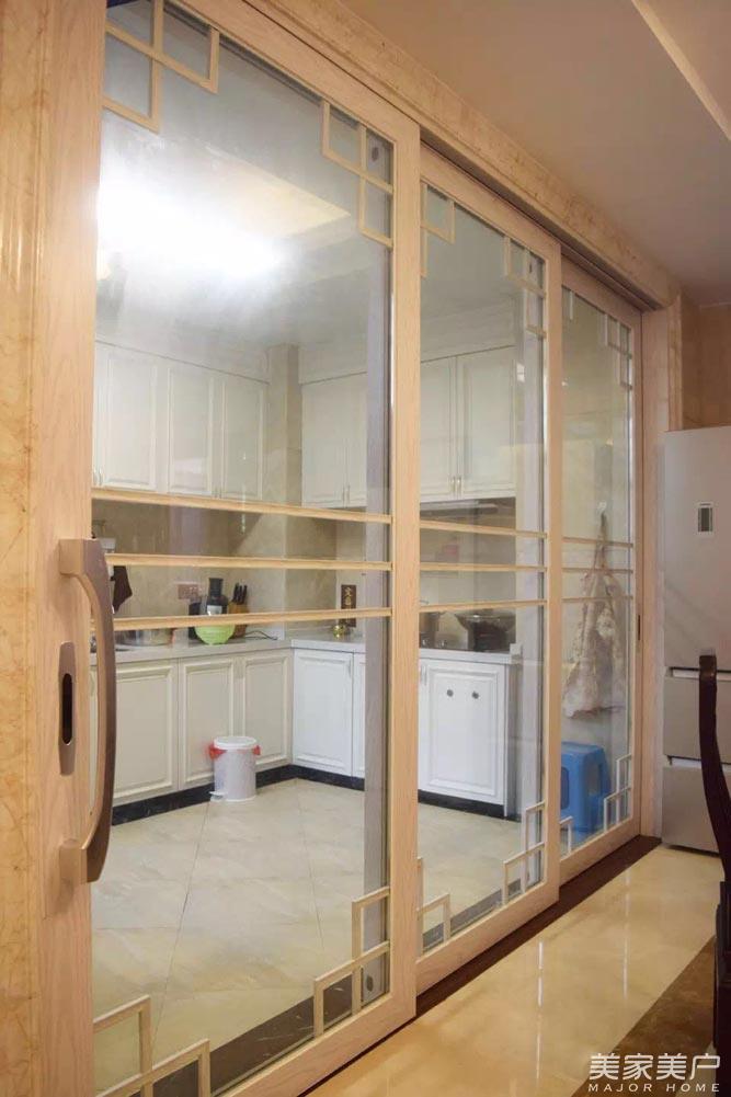 开放式厨房通透、时尚,但是不适用于中式烹饪方式,只需要加装一扇推拉门,达到开放式厨房的时尚感,考虑到厨房是油污重灾区,特意选了台玻安全玻璃,次玻璃具有比普通玻璃更通透、耐油污、易清洁的特点,加州水曲柳颜色与简欧风格的橱柜完美配搭,既能把油烟阻隔在厨房,又通透美观。