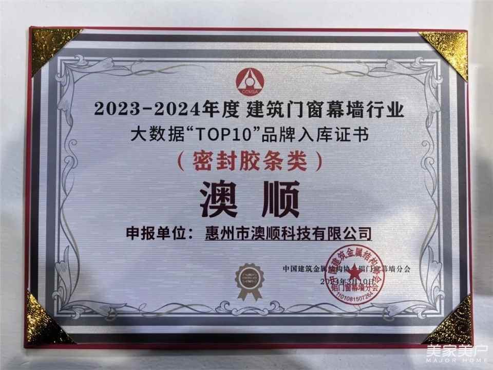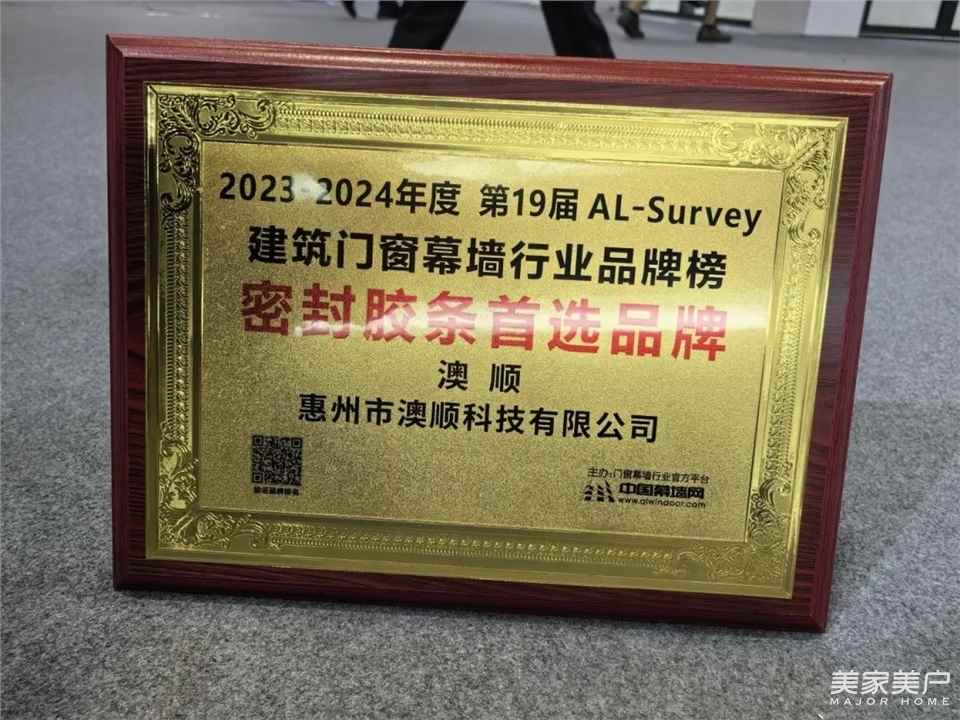 澳顺科技荣膺2023-2024年度第19届AL-Survey建筑门窗幕墙行业品牌榜“密封胶条首选品牌”殊荣,并入选2023-2024年度建筑门窗幕墙行业大数据“TOP10品牌”。这不仅是对澳顺科技长期致力于产品创新和技术发展的认可,也是业内外人士对其产品广泛信任和支持的重要体现。