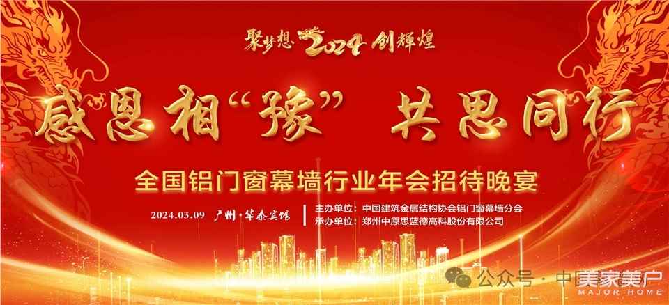 龙重登场|由中国建筑金属结构协会铝门窗幕墙分会主办、郑州中原思蓝德高科股份有限公司连续20年倾心协办的——感恩相“豫”在龙年,共思同行赴新程|第30届全国铝门窗幕墙行业年会“招待晚宴”,2024年3月9日傍晚,在行业年会辉煌的发源地,门窗幕墙人“胶”情深厚的老地方——广州华泰宾馆如期上演,老传统!延续的是感恩与传承,新思路!弘扬的是创新与发展!