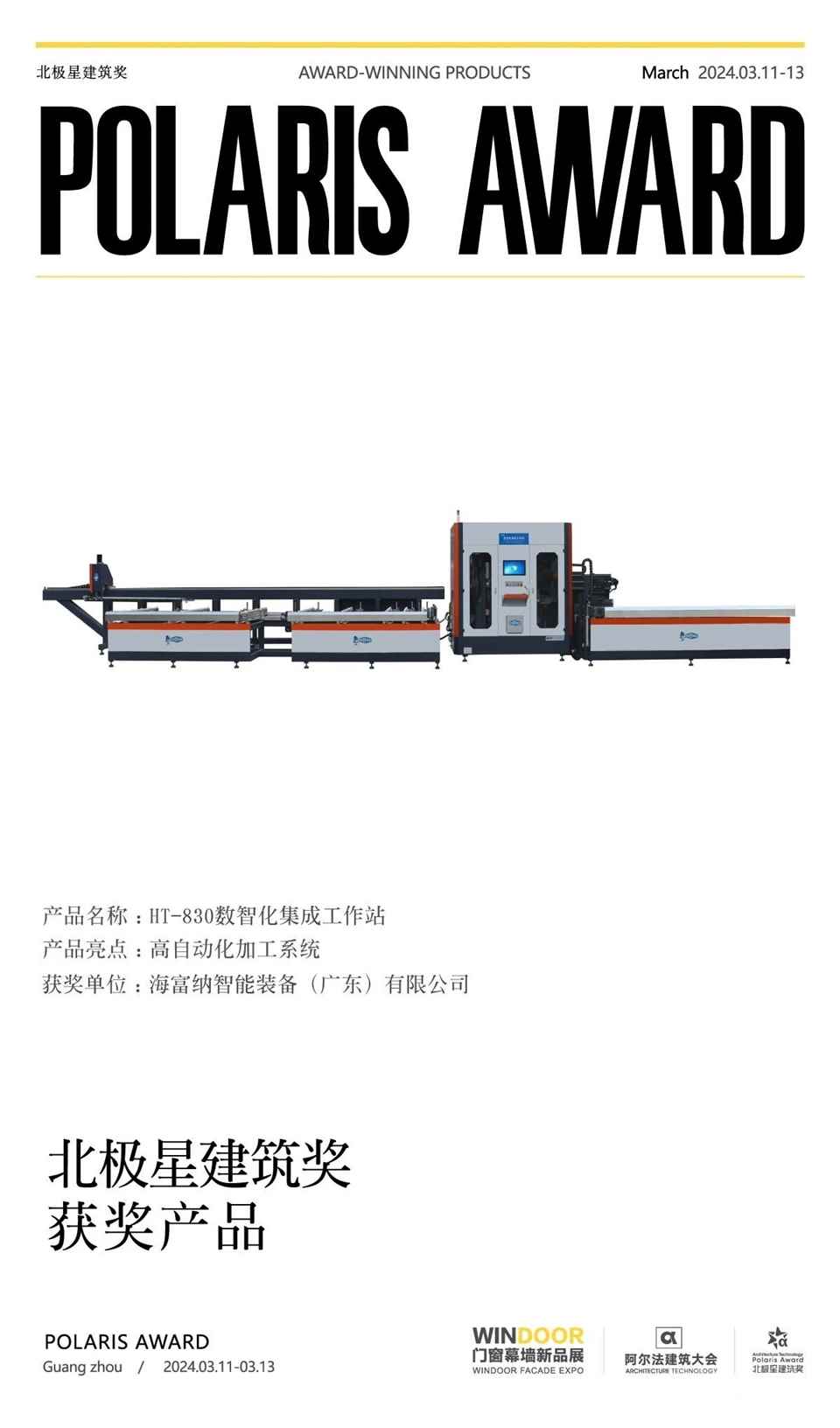 3月10第30届门窗幕墙新产品博览会晚会暨第十届北极星建筑奖颁奖典礼在广州举行。经过专家团队的严格甄选海富纳集团智能装备HT-830数智化集成工作站从234件产品中脱颖而出,荣获“第十届北极星建筑奖”。