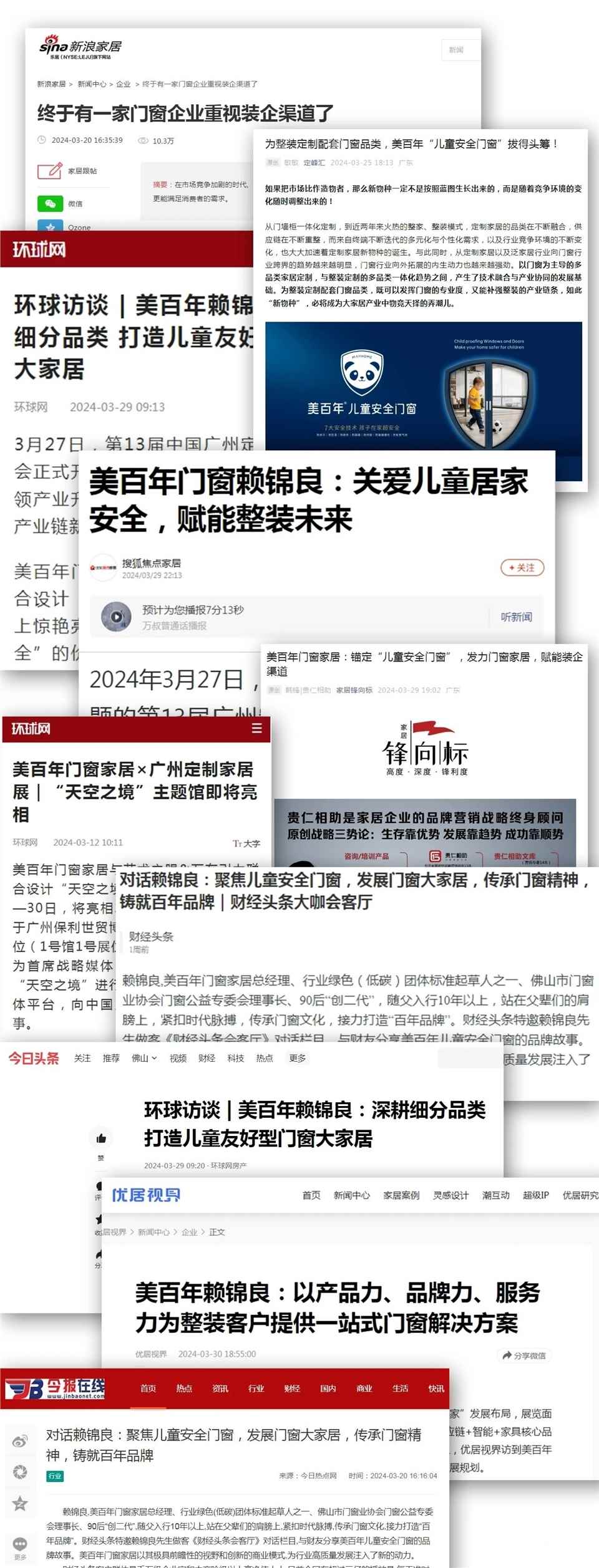 央媒代表环球网家居,财经头条,行业媒体泛家居圈,美家美户,主流门户新浪家居、搜狐、腾讯,中华门窗网,网红自媒体等多个媒体争先报道,以媒体力量,传播“天空之境”的设计初心,为未能来现场的用户朋友们实现“云观展”,让更多用户和商家了解到美百年“门窗定制+全铝定制”的产品实力和“连锁门店零售”+“整装装企渠道”的合作模式,助力“儿童安全门窗家居”可以通过更多元化渠道触达用户。
