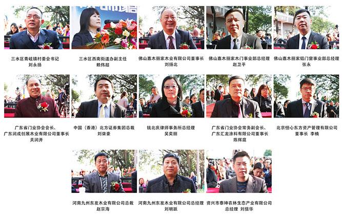 三水区西南街道办副主任赖伟超、三水区青岐镇村委会书记刘永扬、佛山嘉木丽家木业有限公司董事长刘扬北、佛山嘉木丽家木业有限公司总经理刘新林、佛山嘉木丽家木门事业部总经理赵卫平、佛山嘉木丽家铝门窗事业部总经理张永、广东省门业协会会长、广东润成创展木业有限公司董事长关润开、中国(香港)北方证券集团总裁刘棨豪、钱北庆律师事务所总经理吴奕丽、广东省门业协会常务副会长、广东汇龙涂料有限公司董事长陈辉庭、北京恒心东方资产管理有限公司董事长李楠、河南九州东发木业有限公司总裁赵宗海、河南九州东发木业有限公司总经理刘明跃、资兴市泰坤农林生态产业有限公司总经理刘信华以及各企业代表:广州冠军木业有限公司、佛山耀坤木制品有限公司、广东汇泰龙科技有限公司、佛山市顺金美金属制品有限公司、海富纳(中国)集团、佛山金世界创新铝业有限公司、佛山市富球铝业有限公司、佛山市润创五金制品有限公司等共同见证了嘉木丽家历史性的一刻,深圳美家美户家居对这次盛会进行了全程的跟踪报道。