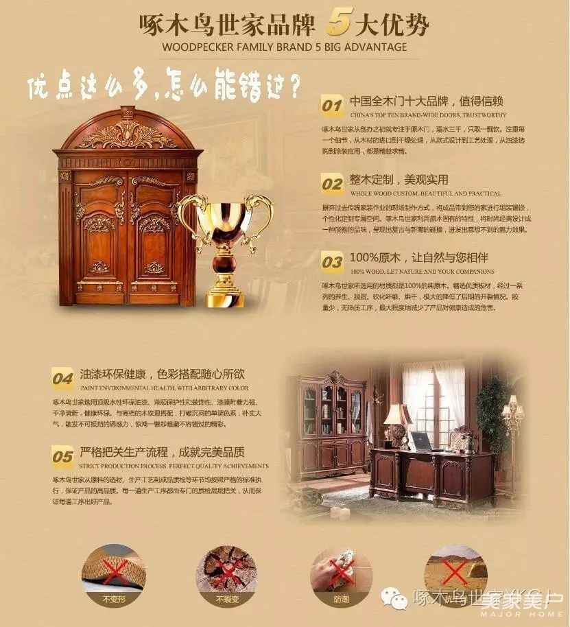 “啄木鸟世家”永远以质量求生存、以技术谋发展、以文化强品牌,精心打造世界一流木制品品牌。展望未来我们将一如既往,以诚信为本、以服务信誉为宗旨,不断开拓、进取,用更优质的产品、更周到、贴心的服务给您带来倍显尊贵的享受!