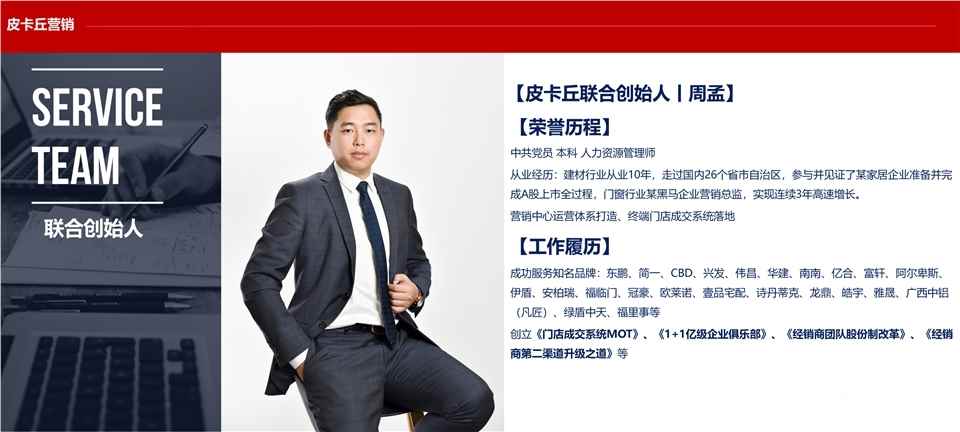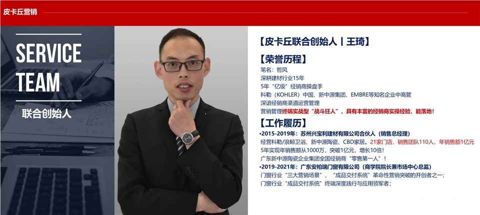 皮卡丘营销作为门窗行业的领先营销服务落地机构,拥有一支由15+余名高管团队组成的精英团队,具有丰富的实战经验和深厚的行业背景。多年来,皮卡丘营销一直致力于为3000万至10亿规模的门窗企业提供全方位的营销支持,已累计为35+家知名门窗企业,提供了卓有成效的营销与落地服务。