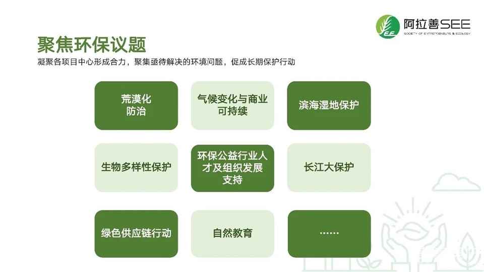 阿拉善SEE生态协会成立于2004年,由近百名企业家在内蒙古阿拉善腾格里沙漠发起。是中国首家以社会责任(Society)为己任,以企业家(Entrepreneur)为主体,以保护生态(Ecology)为目标的社会团体。