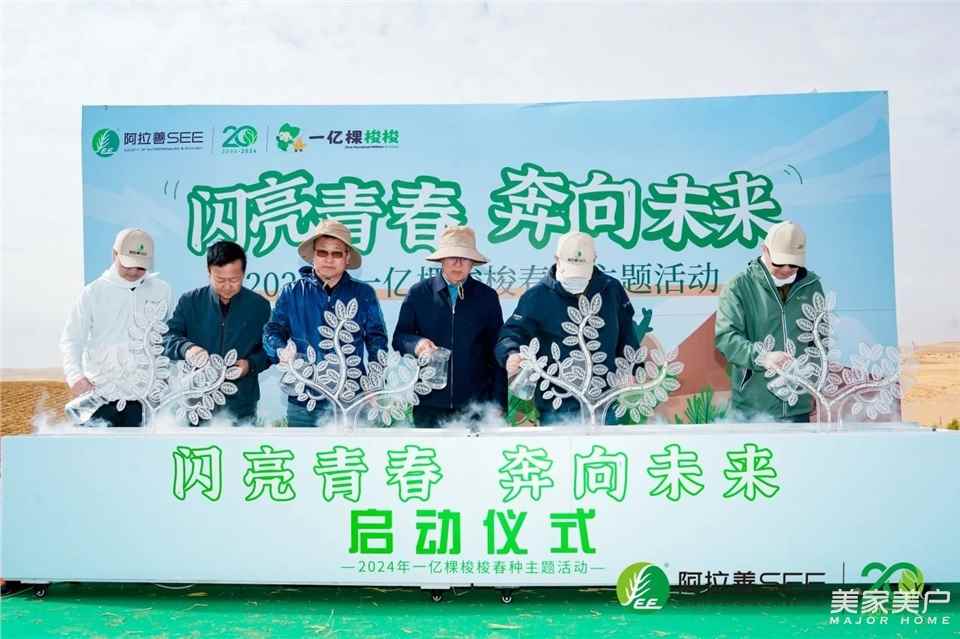 现场,阿拉善盟政协副主席陈君来,阿拉善SEE生态协会会长周洲、副会长肖南,内蒙古中心主席周玉斌、欧大师隔热门窗副总经理张文斐,牧民代表、阿拉善盟左旗吉兰泰镇巴彦乌拉嘎查书记潘多云共同启动2024梭梭春种活动。