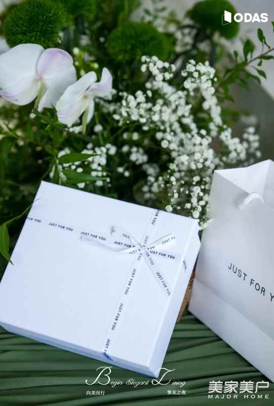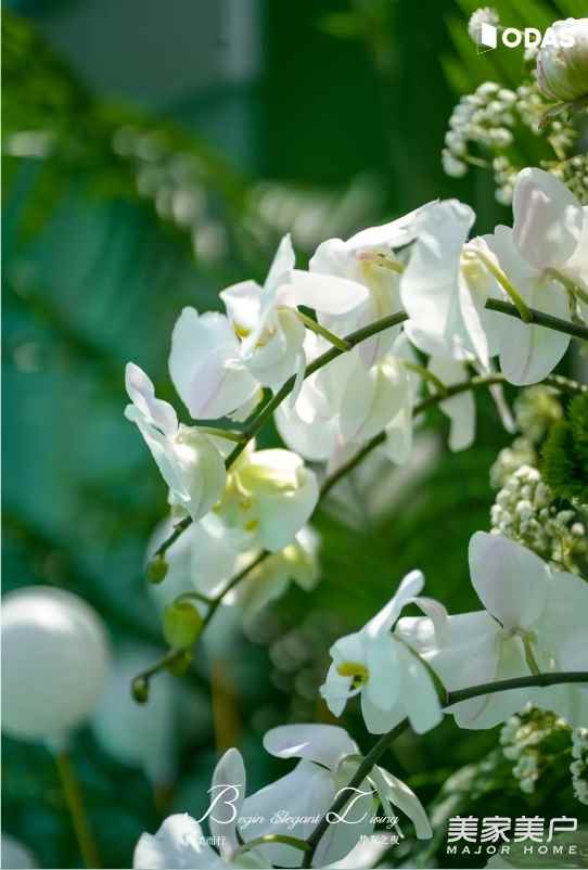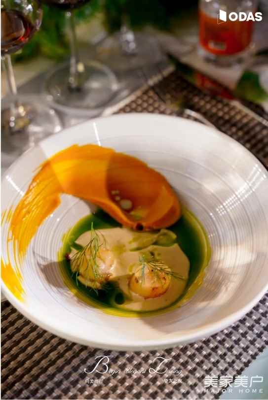 晚宴场地布置以白绿色系为主,点缀橙色,简约而不失高雅。布幔飘逸,营造出浪漫而梦幻的氛围。从场地布置到餐具选择,从红酒品鉴到美食搭配,从创意签到方式到花艺迎宾牌... 无不彰显出ODAS品牌对于美的独特理解和对于品质生活的执着追求。