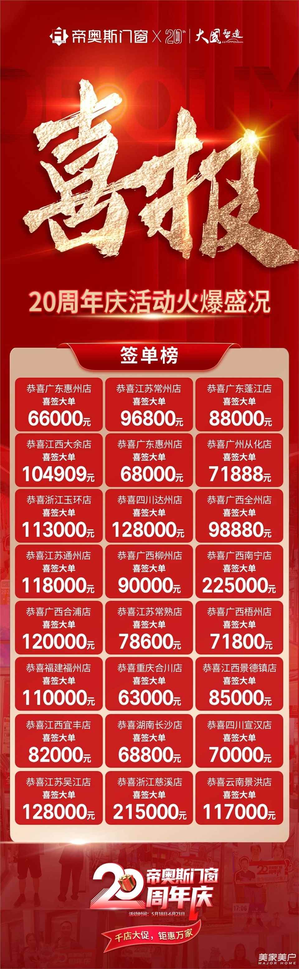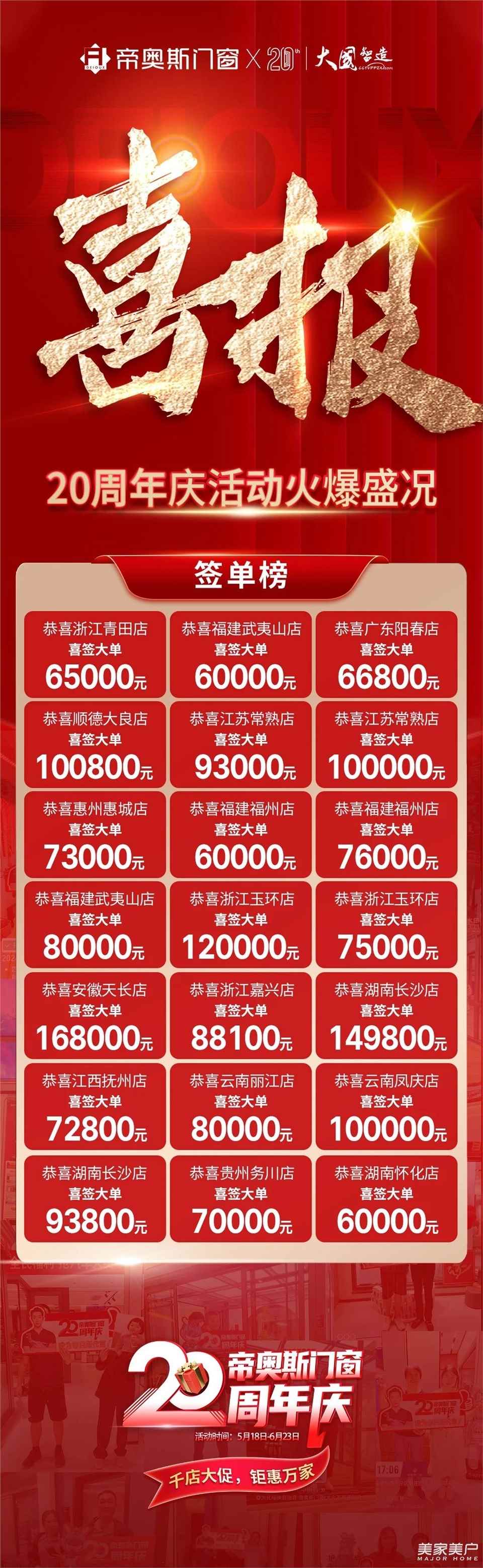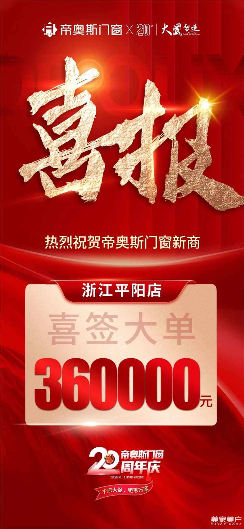 自5月18日至6月23日,帝奥斯门窗携手全国终端门店,盛大启动促销活动。活动期间,我们以精湛工艺打造的优质产品、实实在在的优惠及诚意满满的礼遇,赢得了消费者的广泛赞誉,签单量屡破新高,提前实现并超越了预定目标!