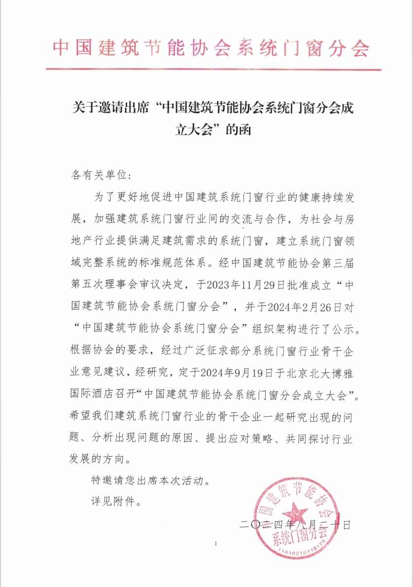 关于邀请出席“中国建筑节能协会系统门窗分会成立大会”的函