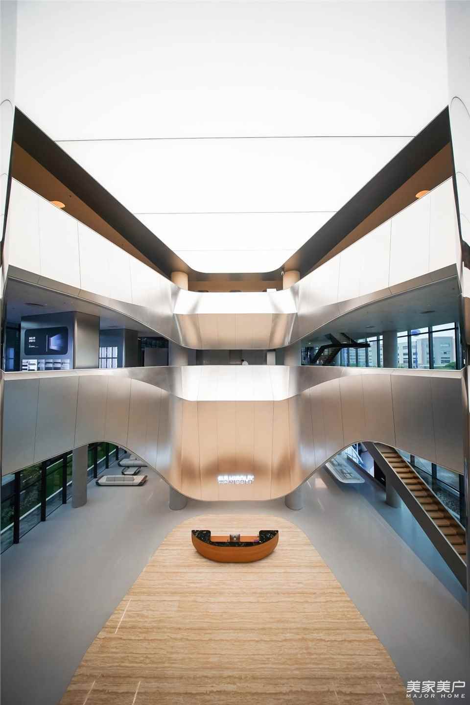 原创基因宛如创意摇篮,畅造万千绮丽佳境,鲲鹏之志造就奢意典范,云集五金美学大成。步入总部一楼大堂,天然石材的细腻质感与钛金属的丝滑光泽相映成趣,恢弘宏伟的钛金装置自下而上、气聚乾坤,如绸缎环绕与天花相连,如五金宇宙浩瀚无垠,如巨龙蜿蜒直抵云际。