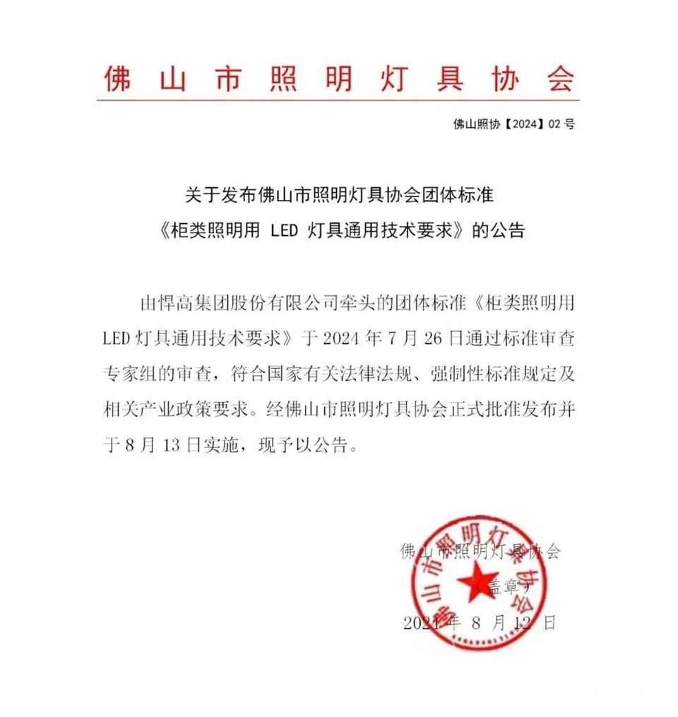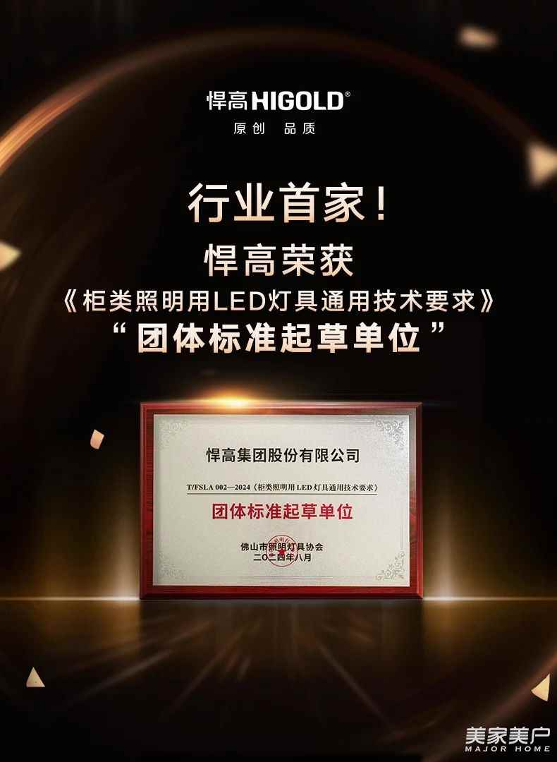 为完善目前柜类照明的国家标准和行业标准,对产品的技术要求进行统一和规范。2024年7月26日,由悍高集团股份有限公司主起草的《柜类照明用LED灯具通用技术要求》团体标准经佛山市照明灯具协会正式批准,已于8月13日全面实施,悍高集团股份有限公司首创行业标准,被评为“《柜类照明用LED灯具通用技术》团体标准主起草单位”。